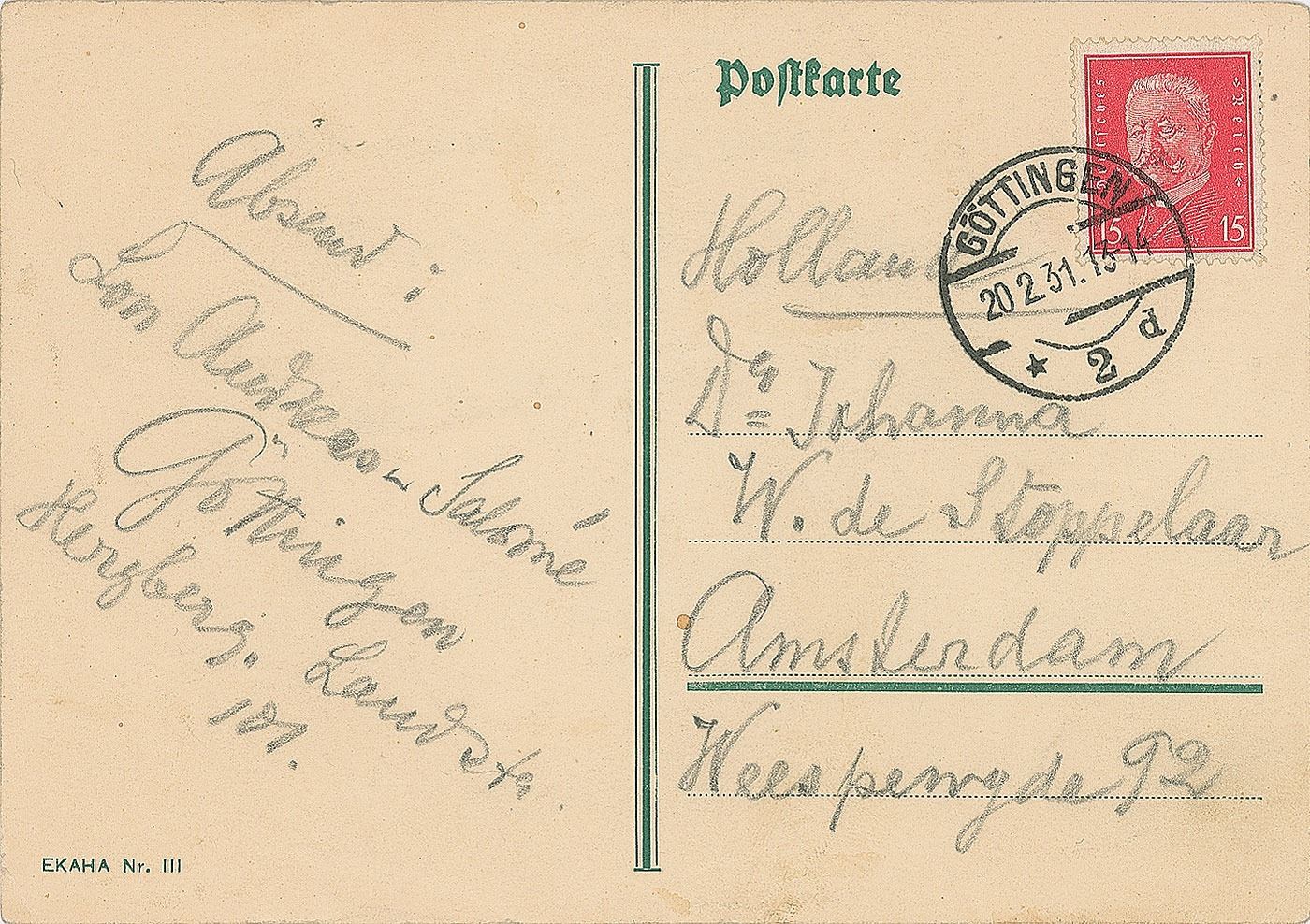Psychoanalyst and writer (1861–1937) who was the muse of Nietzsche, Rilke, and Freud. ANS in German, signed “L. A. S.,” one page, 4.75 x 4, postmarked February 20, 1931. Untranslated note on the reverse of a postcard, addressed in her own hand, incorporating her full signature, "Lou Andreas-Salome," in the return address. In fine condition.
