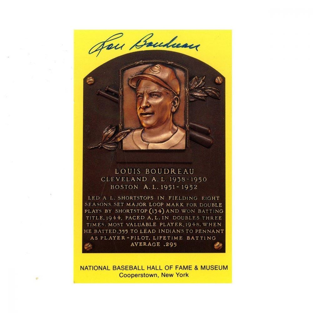 Gold Hall of Fame postcard has been hand-signed in blue felt-tip pen by Lou Boudreau (D. 2001, Indians HOF).