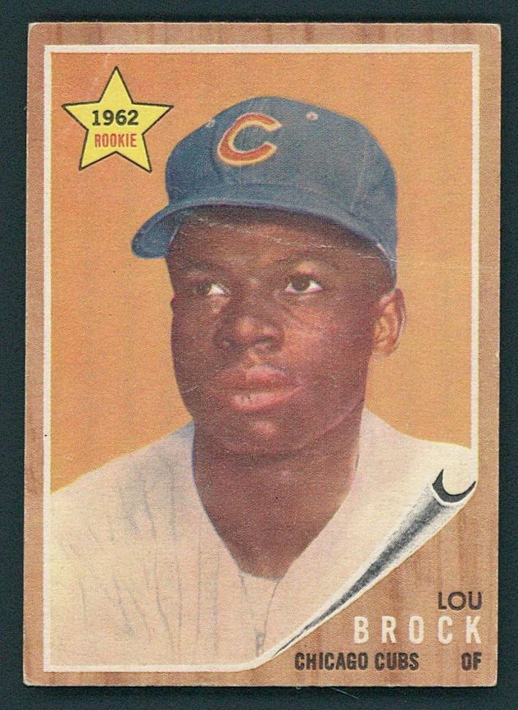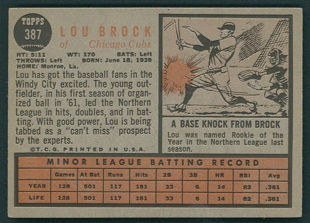 Lou Brock 1962 Topps #387 Rookie Card (Cubs). Beckett value $120. Please see scans for details regarding the condition of the card.