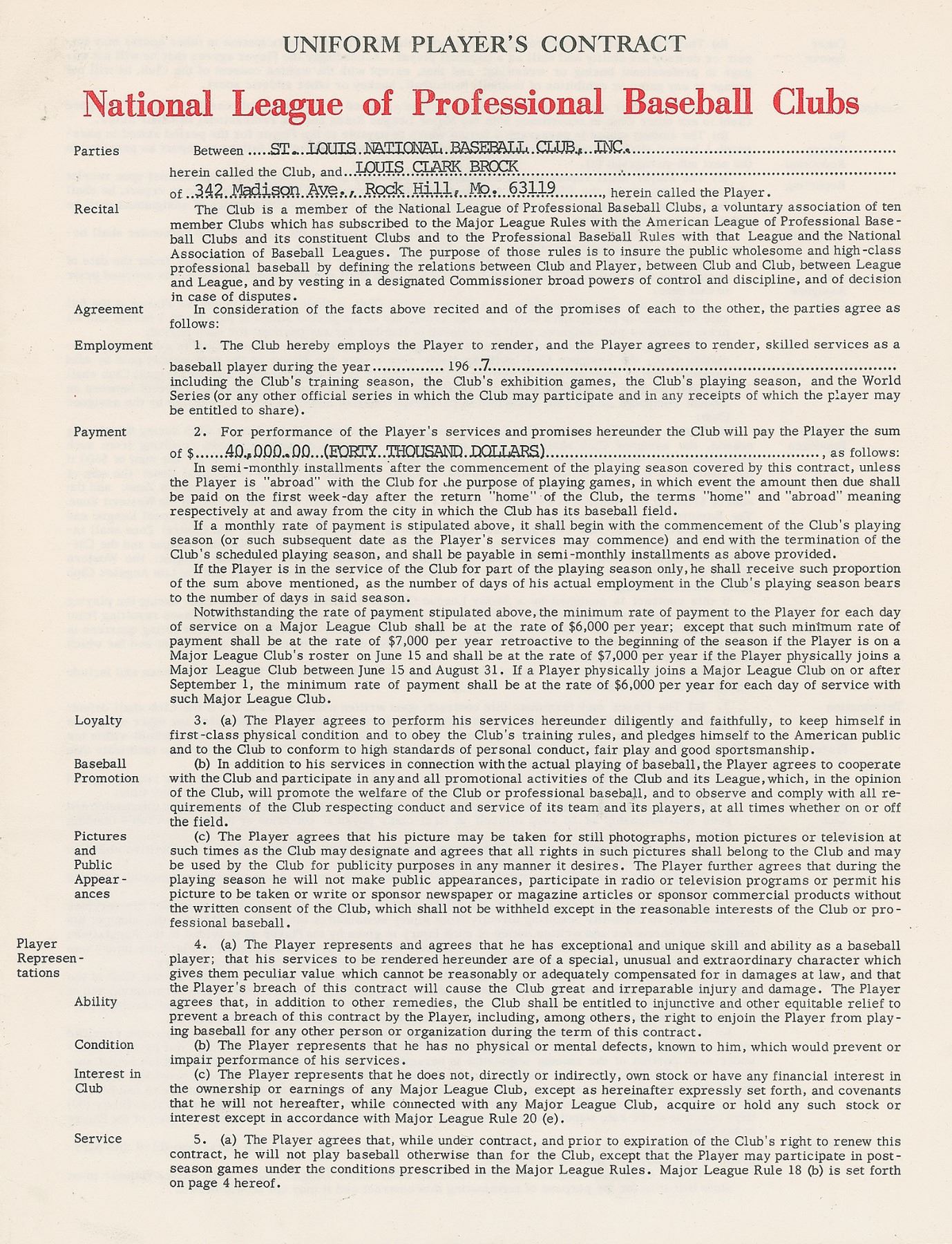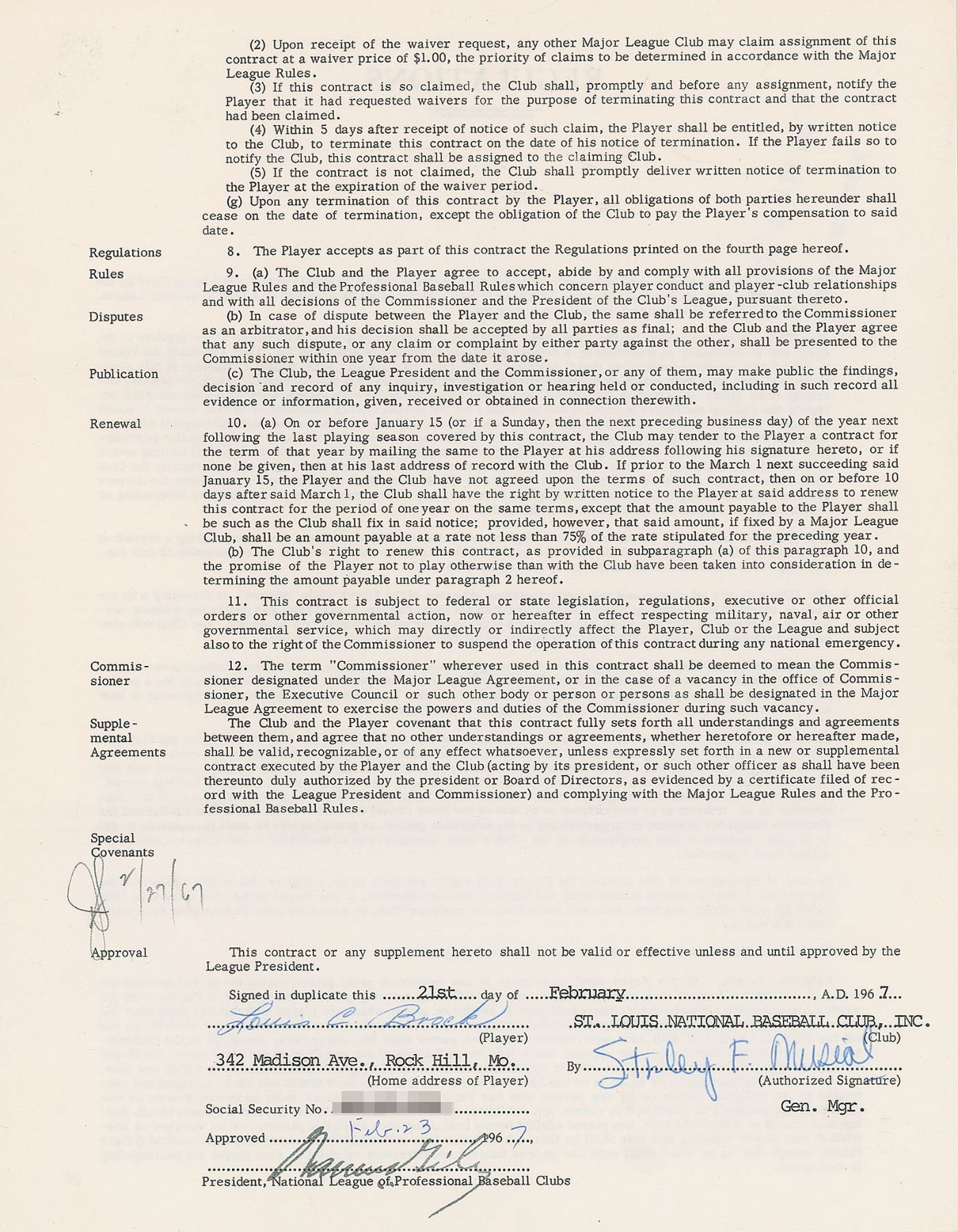 Contract, signed “Louis C. Brock,” four pages on two adjoining sheets, 8.5 x 11, February 21, 1967. National League uniform player’s contract in which Lou Brock agrees to render "skilled services as a baseball player during the year 1967" for the St. Louis Cardinals, for a salary of $40,000. Signed at the conclusion in blue ballpoint by Brock and countersigned by Cardinals General Manager and Hall of Famer Stan Musial and National League President Warren Giles. In fine condition. With 52 steals, 1967 marked the second consecutive season that Brock would lead the National League in stolen bases. From 1966 through 1974, he led the league in steals in but one season.