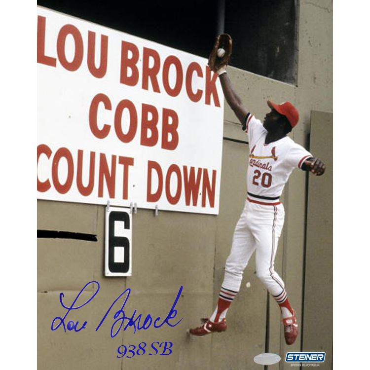 Lou Brock Climbing Wall Catch Signed 11x14 Photo w/"938 SB" Insc.