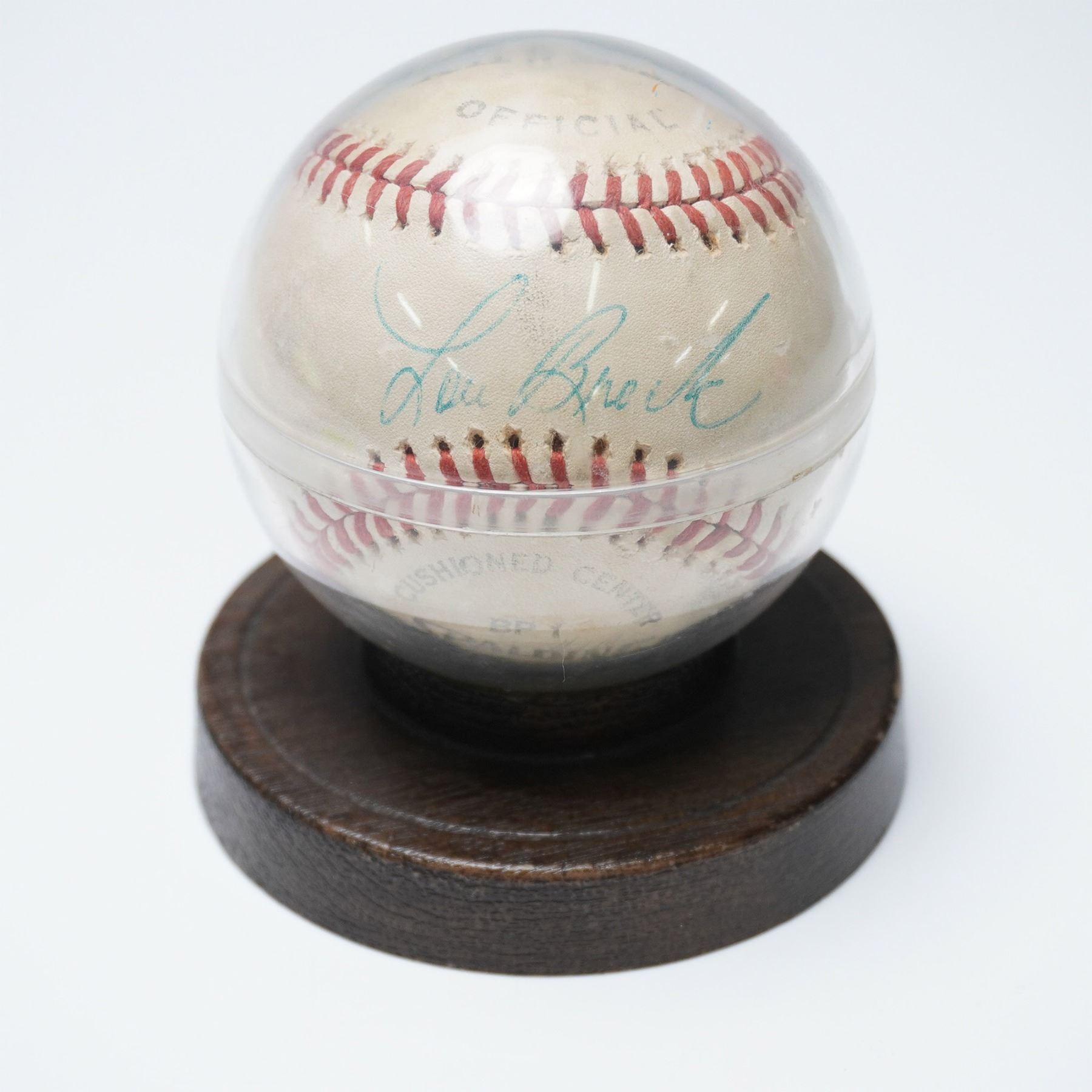 Presented is an official All-Star baseball autographed by Hall of Famer Lou Brock, legendary outfielder of the St. Louis Cardinals. Known for his remarkable speed and base-stealing prowess, Brock played a crucial role in the Cardinals' World Series victories in 1964 and 1967. This signed baseball showcases his signature in blue ink across the sweet spot, preserving the legacy of one of baseball’s greatest leadoff hitters. It is encased in a protective acrylic display case with a wooden base, ideal for collectors and baseball enthusiasts. A prized piece of memorabilia celebrating the illustrious career of Lou Brock.