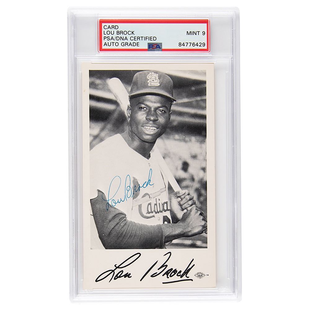 Glossy 3.25 x 5.5 publicity photo of Lou Brock in his St. Louis Cardinals uniform, signed in blue ballpoint. Lower border bears a preprinted autograph. In fine condition. Encapsulated and graded by PSA/DNA as "MINT 9."
