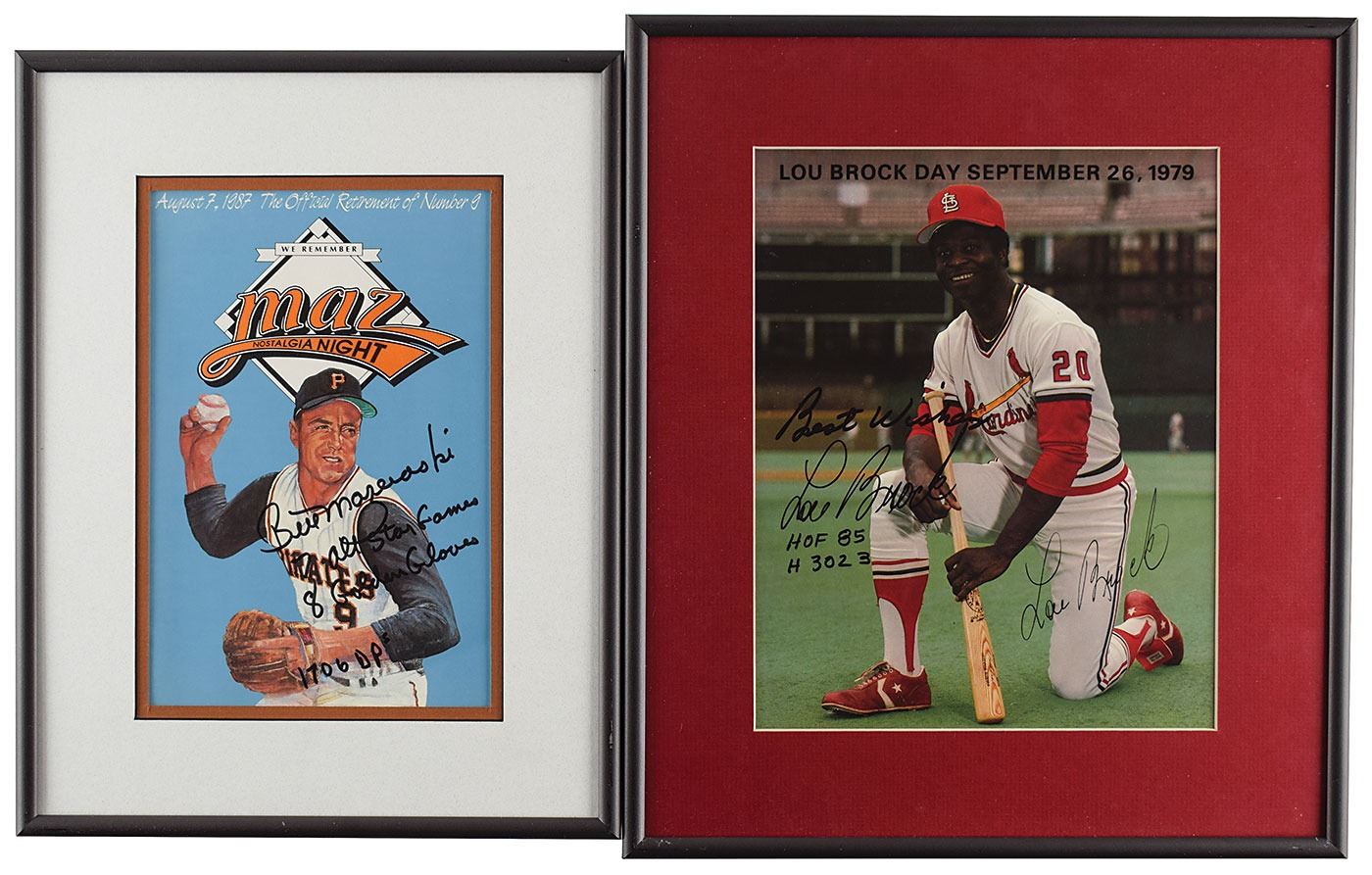 Two programs: one for Lou Brock Day on September 26, 1979, signed in black felt tip, "Best wishes, Lou Brock, HOF 85, H 3023," with a facsimile signature to the lower right; and one for Maz Nostalgia Night on August 7, 1987, signed in black felt tip, "Bill Mazeroski, 7 All Star Games, 8 Golden Gloves, 1706 DPs." Brock is double-matted and framed to an overall size of 12 x 14, and Mazeroski is double-matted and framed to an overall size of 10 x 13 (both using UV-protectant glass and acid free mats). In overall fine condition.