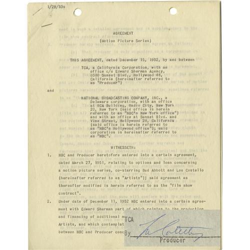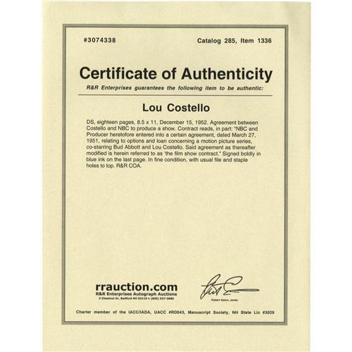<B>Lou Costello Signed Contract.</B></I> An 18-page contract between Costello and NBC, dated December 15, 1952, boldly signed by the comedian in blue ink on the last page. The agreement modifies an existing contract regarding an Abbott and Costello film series. In Very Fine condition with mild overall tanning and the usual staple and punch holes to the top edge. <I>Accompanied by a certificate of authenticity.</B></I><I>Accompanied by LOA from PSA/DNA.</B></I><BR><BR><b>Shipping:</b> Flat Material, Small (<a target="_blank" href="http://www.heritageauctions.com/common/shipping.php">view shipping information</a>) <BR><BR><B>Important notice: