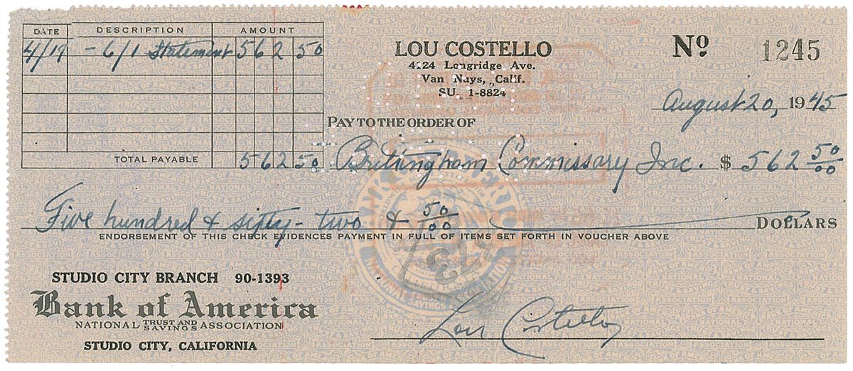 Personal check, 7 x 3, filled out in another hand and signed by Costello, payable to Brittingham Commissary Inc. for $562.50, August 20, 1945. Two vertical folds, a tear to top edge, show-through from stamp on reverse, and cancellation holes near top, otherwise fine condition.