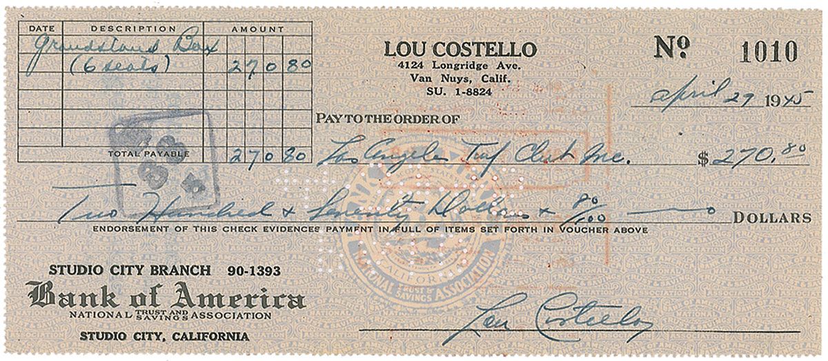 Personal check, 7 x 3, filled out and signed by Costello, payable to Los Angeles Turf Club Inc. for $270.80, April 29, 1945. In the memo section Costello adds, “Grandstand box (6 seats).” In fine condition, with a vertical fold through a single letter of signature and expected stamps and holes, none affecting the clean signature area.