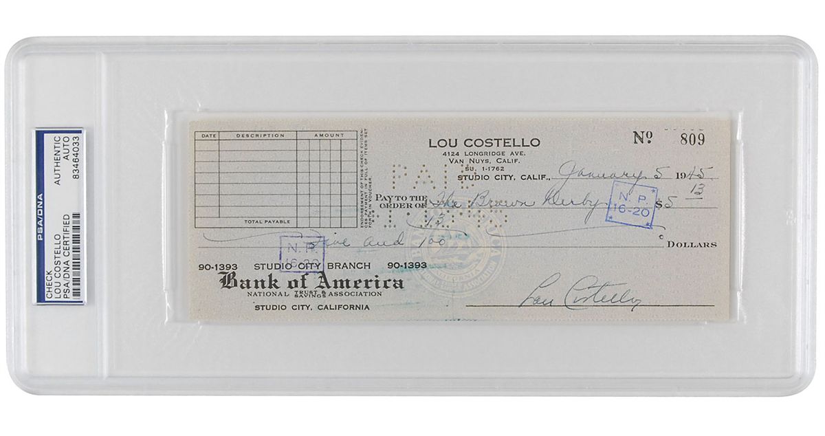Personal check, 8.25 x 3, filled out in another hand and signed by Costello, payable to the Brown Derby for $5.13, January 5, 1945. Encapsulated in a plastic PSA/DNA authentication holder. In fine condition, with cancellation holes to body, and expected stamps to both sides.