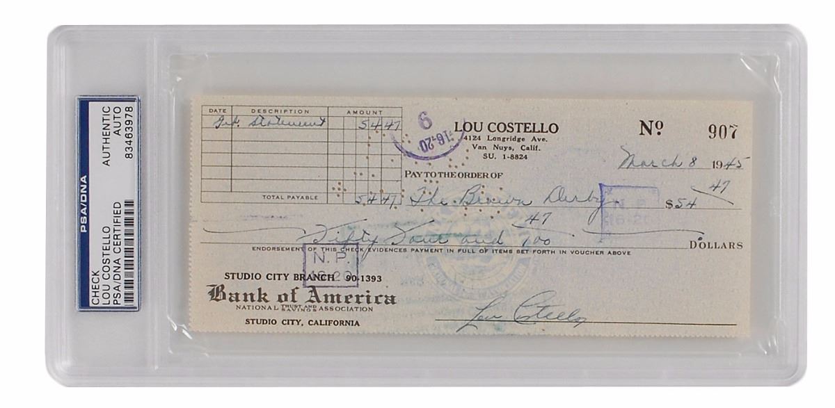 Personal check, 7 x 3, filled out and signed by Costello, payable to The Brown Derby for $54.47, March 8, 1945. Encapsulated in a plastic PSA/DNA authentication holder. In fine condition, with one vertical fold, and expected bank stamps and cancellation holes.