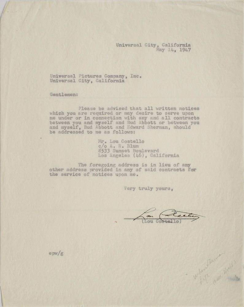 DS, one page, 8.5 x 11, May 14, 1947. In full: "Please be advised that all written notices which you are required or may desire to serve upon me under or in connection with any and all contracts between you and myself and Bud Abbott or between you and myself, Bud Abbott and Edward Sherman, should be addressed to me as follows: Mr. Lou Costello, c/o A. R. Blum, 8533 Sunset Boulevard, Los Angeles (46), California." Signed at the conclusion by Costello. In fine condition.