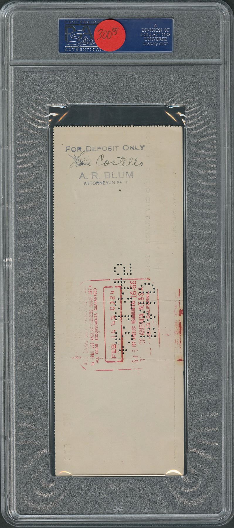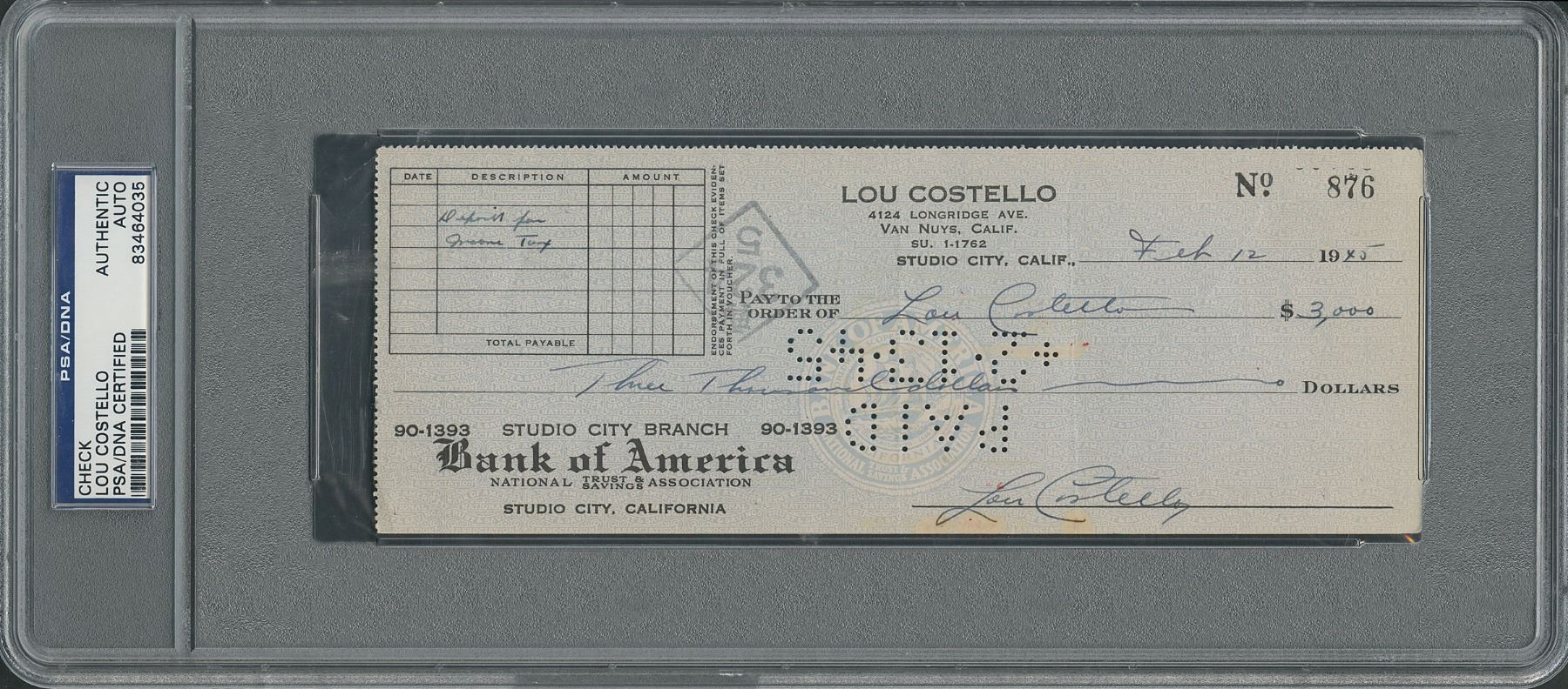 Twice-signed personal check, 8.25 x 3, filled out and signed by Costello, "Lou Costello," payable to "Lou Costello" for $3000, February 12, 1945. In fine condition. Encapsulated in a plastic PSA/DNA authentication holder.