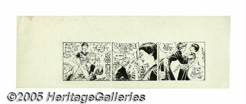 <B>Lou Fine - Adam Ames Daily Comic Strip Original Art, dated 10-26-59 (Hall Syndicate, 1959).</B></I> Lou Fine's incredible draftsmanship allowed him to bring a new level of realism to the action-adventure newspaper strip. His portraits had a subtlety in their depiction of facial expressions that was first-rate. The image area of this daily measures 13.25" x 3.5", and the art is in Excellent condition. Don't this scarce example of a Lou Fine newspaper strip pass you by! <I>From the collection of Gill Fox.</B></I>