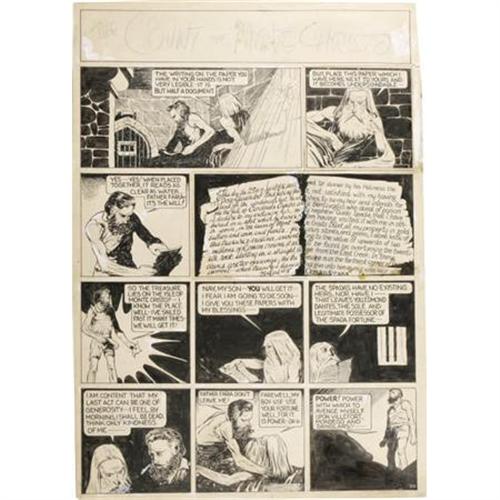 <B>Lou Fine - Jumbo Comics "Count of Monte Cristo" Page Original Art (Fiction House, circa 1940).</B></I> Golden Age great Lou Fine was influenced by hall-of-fame illustrators such as J. C. Leyendecker, John R. Neill, and Harvey Dunn. Working closely with Will Eisner, Lou Fine created an adaptation of Alexander Dumas' Count of Monte Cristo for an early issue of Jumbo Comics. The page has an image area of 15.5" x 22.5". The paper has aged and is missing its title logo; otherwise, the art is in Good condition. <BR><BR><b>Shipping:</b> Flat Material, Large (<a target="_blank" href="http://www.heritageauctions.com/common/shipping.php">view shipping information</a>)