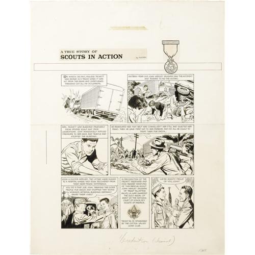 John Wesley Vaughan of Troop 56 comes to the rescue in this thrilling, true-life Boy Scout story "ghost-drawn" by Lou Fine for Al Stenzel, using the pen name "Alsten." This strip has an image area of 12" x 17". The strip was cut between panel tiers one and two and later rejoined with tape; otherwise, it is in Very Good condition.<BR><BR><b>Shipping:</b> Flat Material, Large (<a target="_blank" href="http://www.heritageauctions.com/common/shipping.php">view shipping information</a>)
