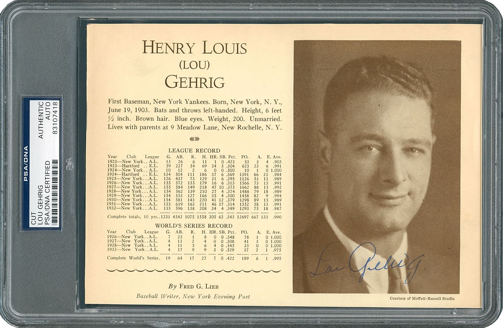 Fantastic partial page from the 1933 edition of Who's Who in Baseball, 8 x 5.75, neatly and prominently signed on the handsome Moffett-Russell Studio portrait in fountain pen, "Lou Gehrig." The cleanly cut page offers a brief biography of the 'Iron Horse,' as well as an outline of his impressive regular season and World Series statistics. In fine condition. Encapsulated in a PSA/DNA authentication holder.