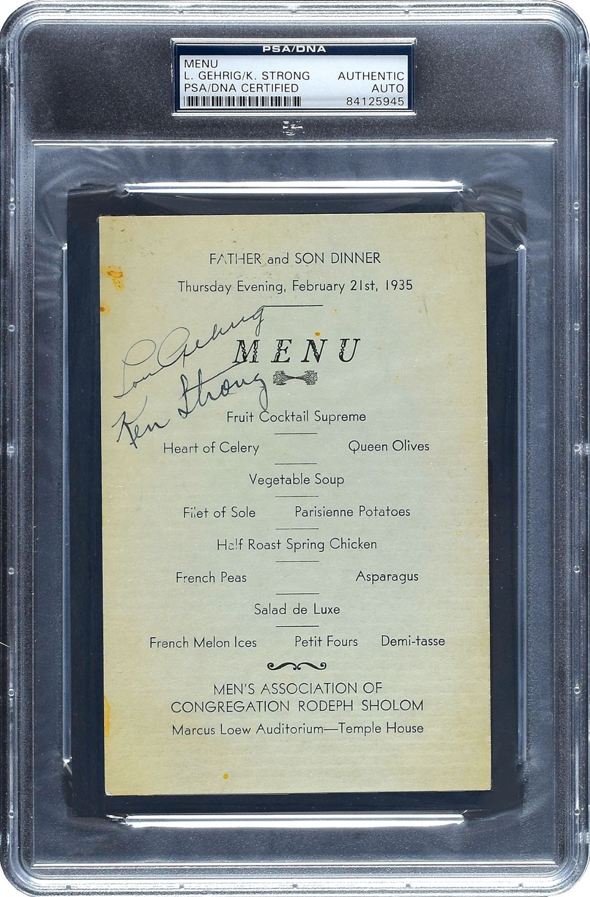 Menu for a "Father and Son Dinner" held by the Men's Association of Congregation Rodeph Sholom at the Marcus Loew Auditorium in New York City on February 21, 1935, signed in fountain pen by Yankees first baseman Lou Gehrig and Giants quarterback Ken Strong. In fine condition, with unobtrusive staining to upper left. Gehrig and Strong were New York's premier athletes at the time—Gehrig was coming off his 1934 Triple Crown season, and Strong had led the Giants to the NFL Championship just two months prior. A fantastic pairing of New York legends. Encapsulated in a PSA/DNA authentication holder.