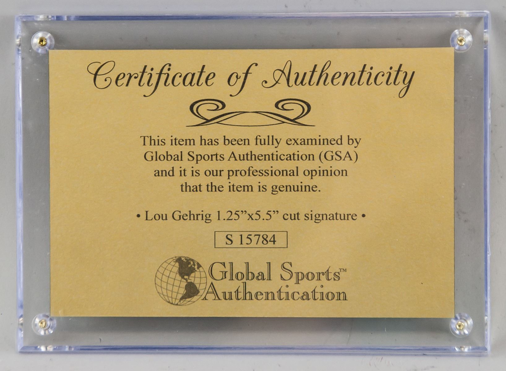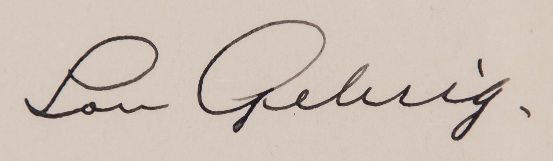 Autographed cut card, signed Lou Gehrig. Accompanied with certificate of authenticity. 12.5 x 17.5 cm. Photograph not included in the lot. Henry Louis Gehrig (1903-1941), nicknamed "The Iron Horse", was an American baseball first baseman who played his entire professional career in Major League Baseball for the New York Yankees. Gehrig was renowned for his prowess as a hitter and for his durability, which earned him his nickname "The Iron Horse."