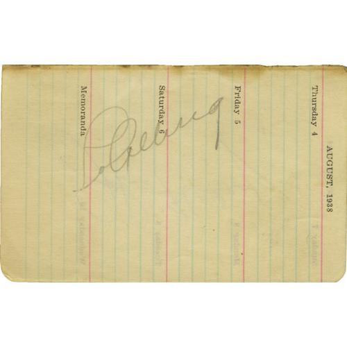 <B>1938 Lou Gehrig Signed Pocket Calendar Page.</B></I> The brave Yankee hero signs an August 1938 pocket calendar page for a fan, suggesting this autograph dates to the month of Gehrig's record twenty-third and final grand slam home run. The pencil signature on this 2.5x4" page rates an impressive 9/10 in strength, and the page shows toning along the upper edge that does not infringe upon the autograph itself, otherwise EX-MT. <I>LOA from PSA/DNA. LOA from James Spence Authentication.</B></I><BR><BR><b>Shipping:</b> Miscellaneous Collectibles, Smal (<a target="_blank" href="http://www.heritageauctions.com/common/shipping.php">view shipping information</a>) <BR><BR><B>Important noti