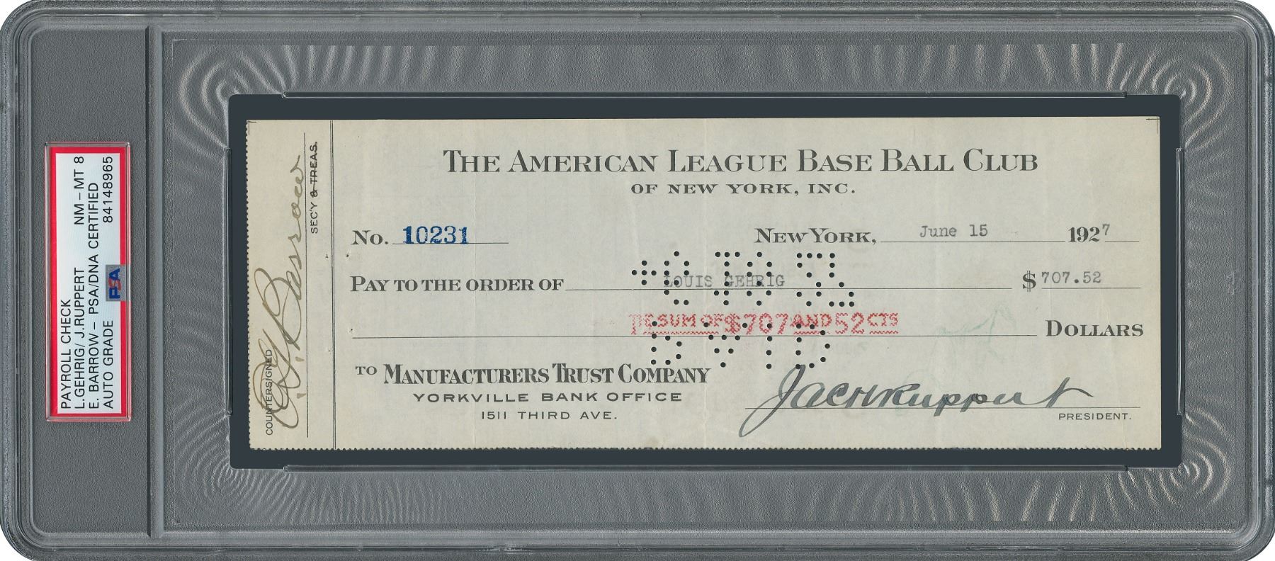 The American League Base Ball Club of New York, Inc., payroll check, 9 x 3.25, filled out in type and signed by Jacob Ruppert as president, payable to Louis Gehrig for $707.52, June 15, 1927. Endorsed neatly on the reverse in fountain pen by Lou Gehrig, and vertically countersigned on the front by Ed Barrow as secretary. In fine condition. Anchoring the heart of the notorious 1927 New York Yankees 'Murderer's Row' lineup as the cleanup hitter behind Babe Ruth, Lou Gehrig started off the season at a sweltering pace—by the time he received this payroll check, he had already tallied 14 home runs and 60 RBI, and was batting .391. He finished with a record-breaking 173 RBI, was named the American League's MVP, and led the Yankees to a then-league record 110 wins and a four-game sweep of the Pirates in the World Series. The 1927 Yankees are considered by many to be the greatest team in baseball history, and this payroll check for their iconic cleanup man—signed by three Hall of Famers—is a magnificent relic from the legendary season. Encapsulated and graded by PSA/DNA as NM-MT 8, and accompanied by a full letter of authenticity from JSA.