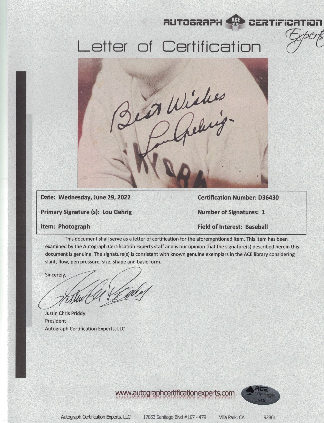 Lou Gehrig (June 19, 1903 – June 2, 1941) Signed 8 X 10 Black and White Photograph. Quiet and unassuming, Gehrig struggled to make friends with many of his colorful and spotlight-hungry Yankee teammates, especially Ruth. But his hardworking nature and ability to play through incredible pain certainly earned their respect and earned him the nickname "The Iron Horse." Yankee fans, meanwhile, were thankful just to have him in the lineup. His Hall of Fame career saw him score 100 runs and knock in at least that many in 13 consecutive seasons. In 1931, he set an American League record by clubbing 184 RBIs, and in 1932, he became the third player to hit four home runs in a single game (it's only been done 16 times ever). In the World Series, Gehrig was equally impressive, batting .361 over the course of his career, while leading the club to six championships. This item has been professionally custom matted and framed. Comes with a Letter of Authentication from Guaranteed Forensic Authenticators, along with the GFA guarantee of authenticity.