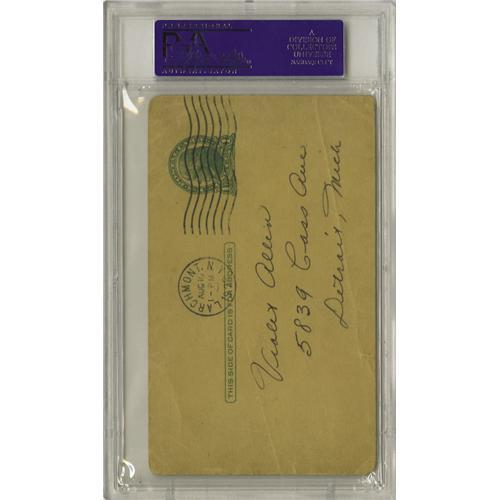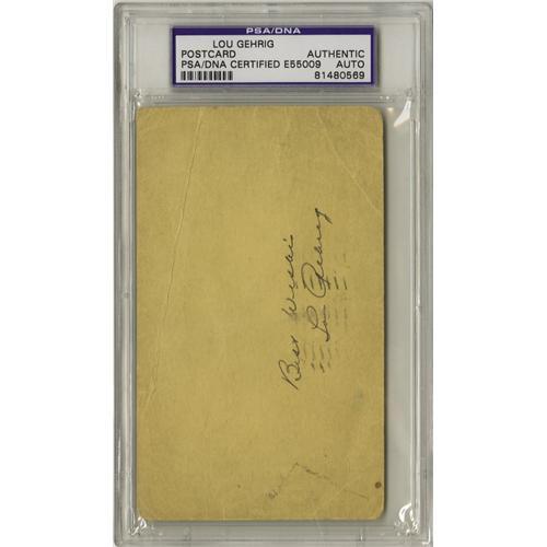 <B>1938 Lou Gehrig Signed Government Postcard.</B></I> Just ten days before the Iron Horse clubbed his twenty-third and final career grand slam, he mailed this postcard to a female fan from his Larchmont, New York home town post office on August 10, 1938. A bold black ink inscription reads simply, "Best Wishes, Lou Gehrig," with postal stamping crossing the inscription to little effect. The handwritten address on the opposing side is also penned by the tragic Hall of Famer. Some diagonal creasing is evident, but Gehrig's inscription is unaffected by this. With government postcards experiencing an entirely understandable surge in collecting appeal due to the built-in provenance, the wise collector knows he cannot go wrong with an example from Yankee royalty. Slabbed by PSA/DNA for protection and unquestioned authenticity. <BR><BR><B>Important notice:</B> Heritage usually auctions material at the rate of 200-250 lots per hour. On some occasions eBay Live bid software or the Internet may not be able to keep up with the pace of the auction. We recommend placing a realistic absentee bid now as insurance to avoid disappointment. Occasionally the auctioneer may eliminate or reject an eBay Live bid, and the auctioneer may also reopen a lot after the close of the eBay live bidding (usually because we missed an audience bid), and may reject your bid even if it shows you as the winning bidder. By bidding via eBay Live, you agree that Heritage may award the lot to another bidder at its sole discretion under the circumstances described above or any other reasonable circumstances. Since eBay bids are not shown to us until we open the lot on the floor, we treat those bids just like floor bids. In most cases the floor responds before the eBay bid is presented to us, due to Internet lag time, so for consistency we have made it a policy that floor bids are always considered first over tie eBay live bids. Also please note that all Heritage lots purchased through eBay Live carry a 22.5% Buyer's Premium. Please make sure you read the Terms and Conditions before you bid. This lot is being auctioned in conjunction with a live floor auction by Heritage Galleries & Auctioneers. All final auction and invoice information will be supplied by Heritage Galleries & Auctioneers, and all other information should be considered preliminary. Lot:19071 <BR><BR><B>Winning Notification and Billing:</B> After the FINAL session in this auction is complete, Heritage will send e-mail and snail mail invoices. This process normally takes several days. All final auction and invoice information will be supplied by Heritage Galleries & Auctioneers, and all other information should be considered preliminary. <BR><BR>This auction will be conducted on a live auction floor and over the Internet through eBay Live. If you choose to place an absentee bid, please take a moment to <font color='#0000ff'><u><a href='http://pages.ebay.com/liveauctions/help/before/laabsentee.html'>learn how eBay Live absentee bidding works</a></u></font><font color='#000000'>
