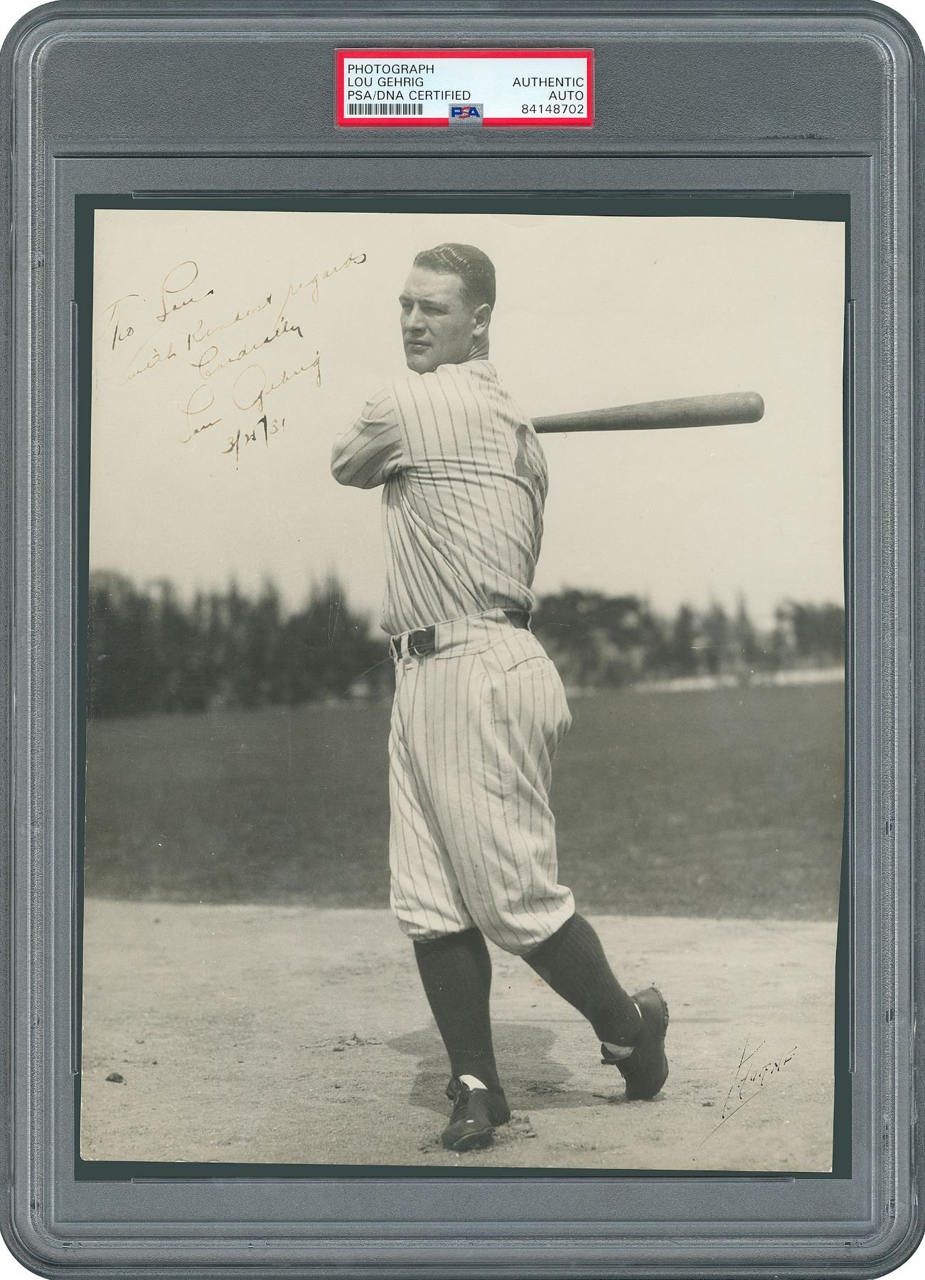 Magnificent vintage matte-finish 8 x 9.75 full-length photo of Gehrig during New York Yankees spring training at Miller Huggins Field in St. Petersburg, Florida, signed and inscribed in fountain pen, "To Lou, with kindest regards, Cordially, Lou Gehrig, 3/25/31.” Lower left corner signed by the photographer, "Thorne," with reverse bearing a Thorne Studios photography stamp. In very good to fine condition, with trimmed edges, scattered creasing, and slight fading to ink; the flaws in no way detract from the otherwise sensational pose. Thorne Studios was one of several photography studios used by the Yankees to take official publicity photos for the club. Encapsulated in a PSA/DNA authentication holder. Accompanied by a full letter of authenticity from JSA.