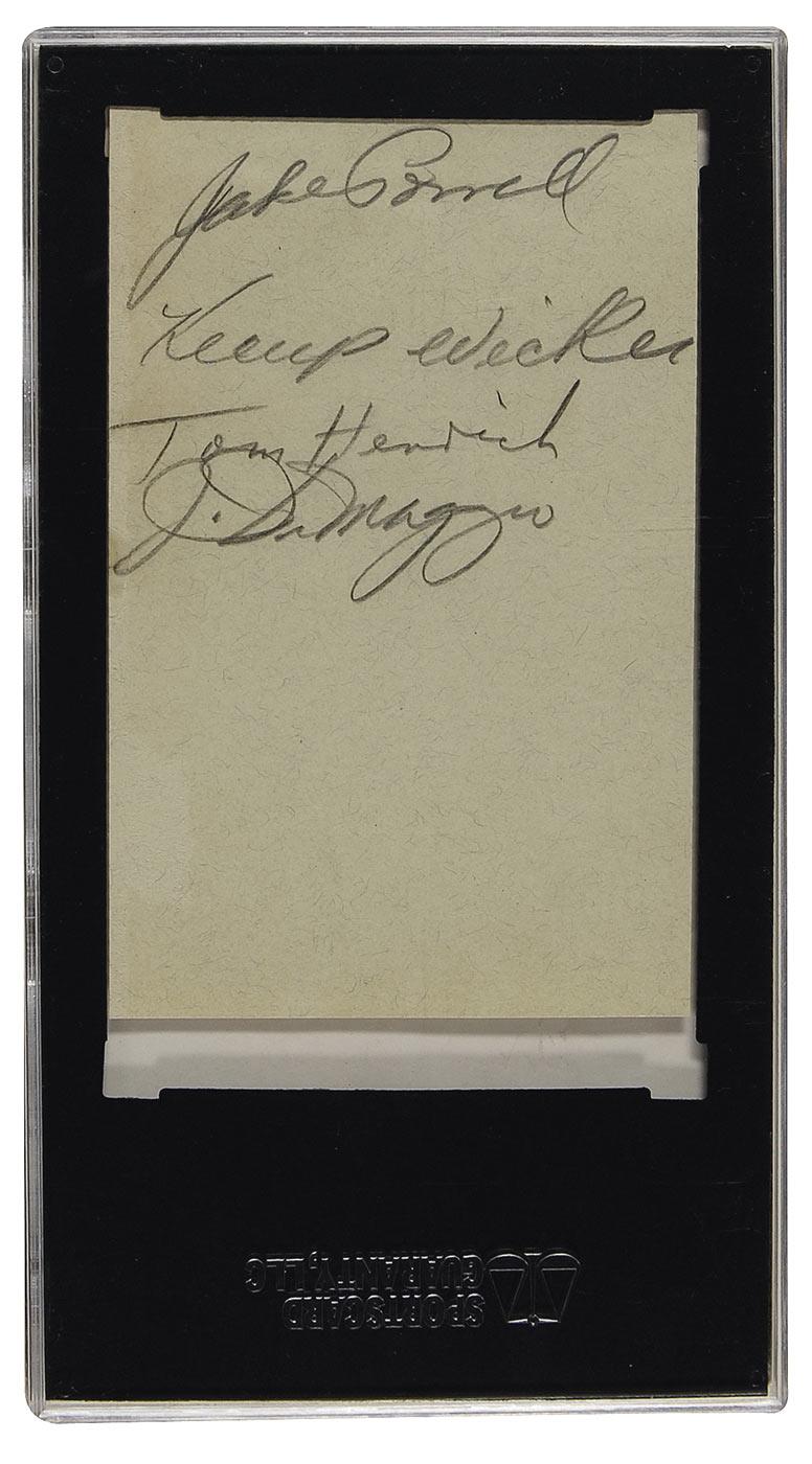Vintage ink signature, “Lou Gehrig,” and a vintage pencil signature, “Joe DiMaggio,” from his rookie year, on opposite sides of a light green 5 x 3 album page. DiMaggio’s side is also signed in pencil by three Yankee teammates: Jake Powell, Tom Henrich, and Kemp Wicker. Encapsulated in a plastic SGC authentication holder. In fine condition. A scarce and extremely desirable paring of two of the greatest players to ever don the Yankee pinstripes.