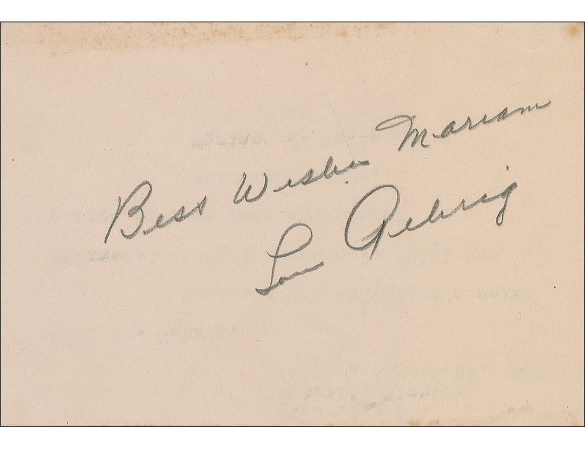 Vintage pencil signature, “Best Wishes Mariam, Lou Gehrig,” at the conclusion of an off-white 5 x 8 sheet, on which the admirer typed a short letter requesting the signature, dated August 29, 1937. In fine condition, with some faint mirroring from the typed text, and a light strip of foxing across the top edge. Accompanied by the original mailing envelope.
