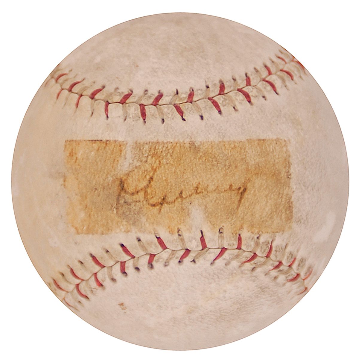 Official Spalding baseball signed in fountain pen on the sweet spot. In good condition, with a moderate block of toning over signature from old tape which has since been removed, light overall soiling to ball, and signature a shade or two light, but mostly legible.