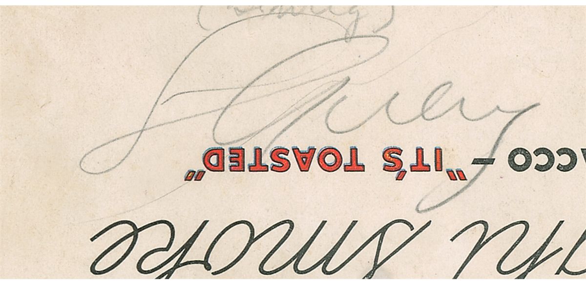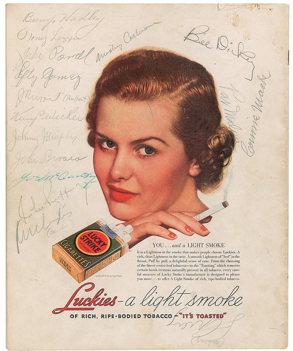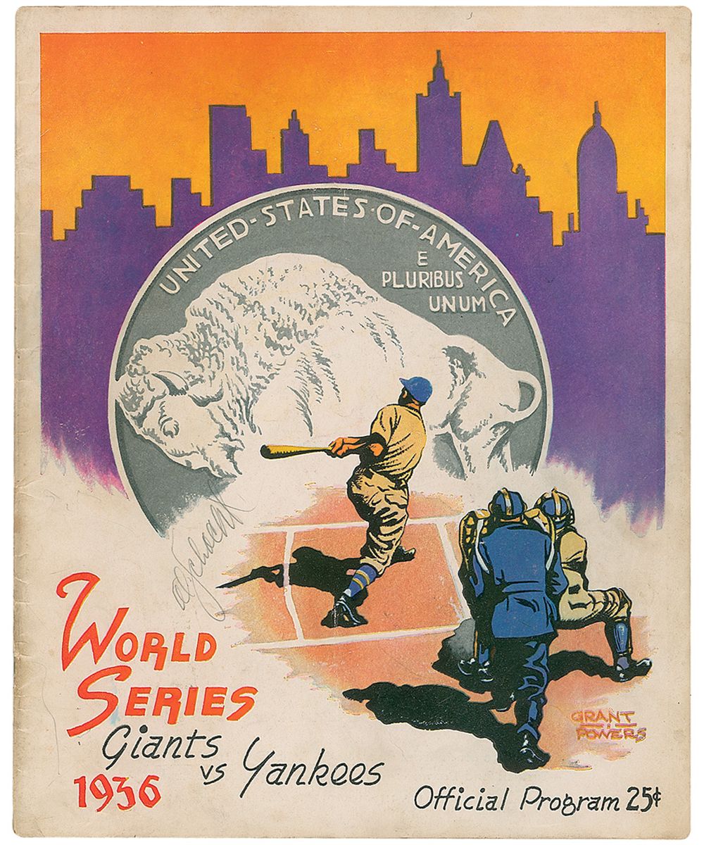 Original program from the 1936 World Series between the Yankees and Giants, 9 x 11, signed on the back cover in pencil by 16 players and executives. Signers include: Lou Gehrig (signed upside down), “K. M. Landis,” Connie Mack, Joe McCarthy (signed in fountain pen), Mickey Cochrane, Charles Ruffing, Tony Lazzeri, Lefty Gomez, Bill Dickey, “J. Rupert,” Bump Hadley, Jake Powell, Kemp Wicker, Johnny Murphy, John Broaca, and Pat Malone. Program is also signed on the front cover by Al Schacht. In very good condition, with scattered toning and soiling to covers, expected handling wear, small collector’s notations next to a few of the signatures, and a mild central vertical crease. Accompanied by a copy of a certificate of authenticity from James Spence. An impressive gathering of baseball luminaries, in which the Yankees won their first World Series without Babe Ruth and their first with Joe DiMaggio.
