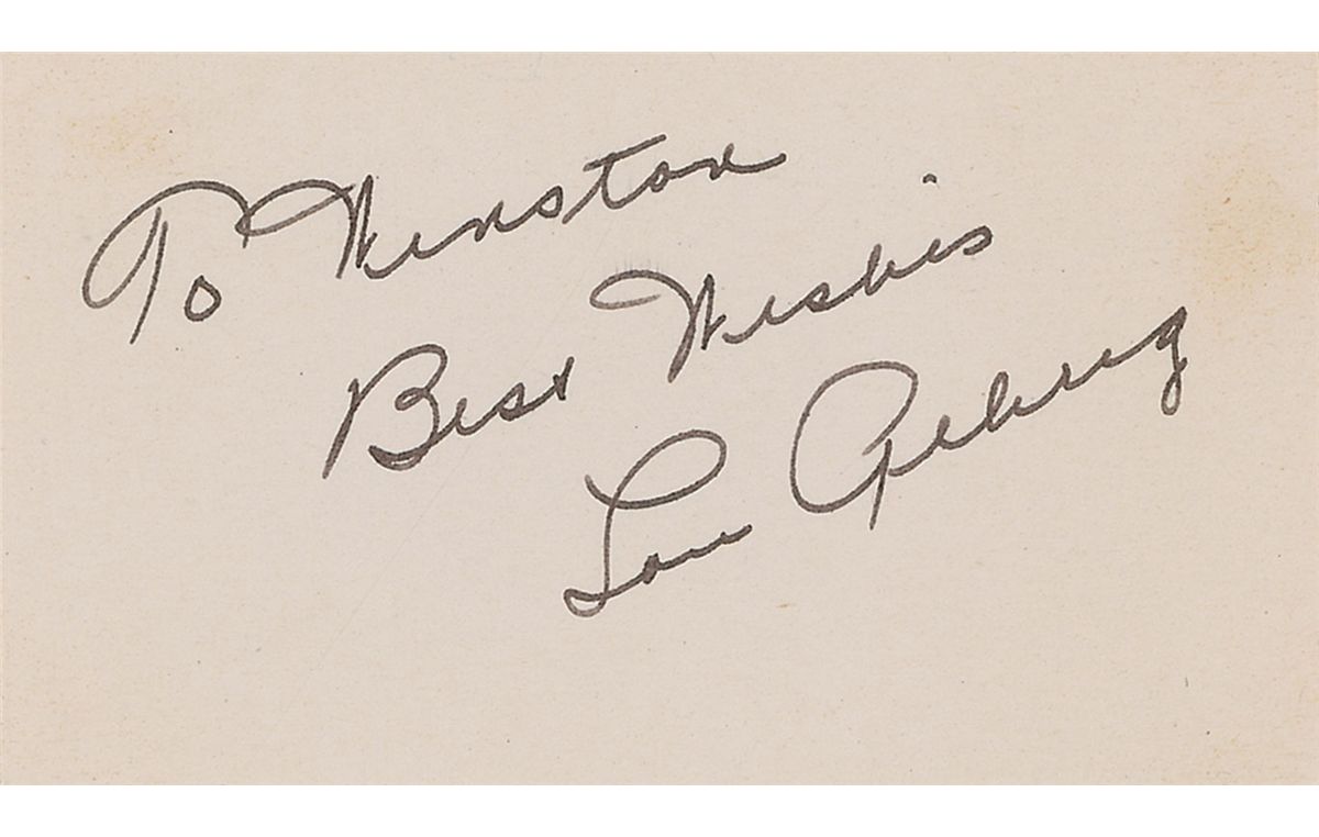 Vintage ink signature and inscription, “To Winston, Best wishes, Lou Gehrig,” on an off-white 3.5 x 2 card. A trivial spot of toning to right edge, otherwise very fine condition. A superb example of one of baseball’s most desirable signatures.