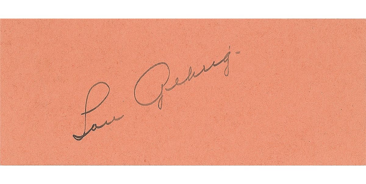 Choice vintage fountain pen signature, “Lou Gehrig,” on a peach 3.75 x 1.5 card. In very fine condition. An especially clean, crisp signature.
