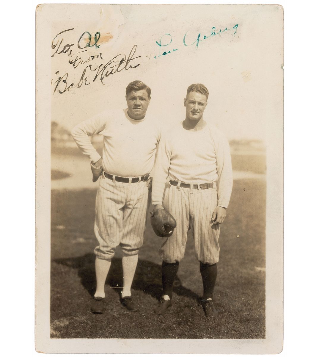 Pearl-finish 5 x 7 photo of Lou Gehrig and Babe Ruth together during spring training in 1928, both wearing their baseball gloves and pinstriped Yankees pants, signed in fountain pen, “Lou Gehrig.” The photo also bears a clubhouse signature and inscription penned on behalf of Ruth, “To Al, From ‘Babe’ Ruth.” This image was captured by Thorne, the official Yankees team photographer from the 1920s through 1940s, and bears the appropriate Thorne Photo credit stamping on the reverse. In very good condition, with a few light creases, portions of Gehrig’s signature a bit faded, and a small area of surface loss affecting the recipient’s name in the clubhouse inscription, which has since been retouched. Thorne photos are collectible in themselves given their high quality, fine composition, and sharp focus. It is quite common for clubhouse signatures to appear on Ruth and Gehrig items from this era, as both superstars were completely inundated with requests; the clubhouse attendants were well-practiced and able to adequately imitate Ruth’s signature, so it does not look out of place on this photograph or detract from its overall aesthetic. Signed photos of Gehrig are quite scarce, with this being a particularly appealing example as it depicts him in the prime of his career, posed with Ruth and wearing his first baseman's mitt.