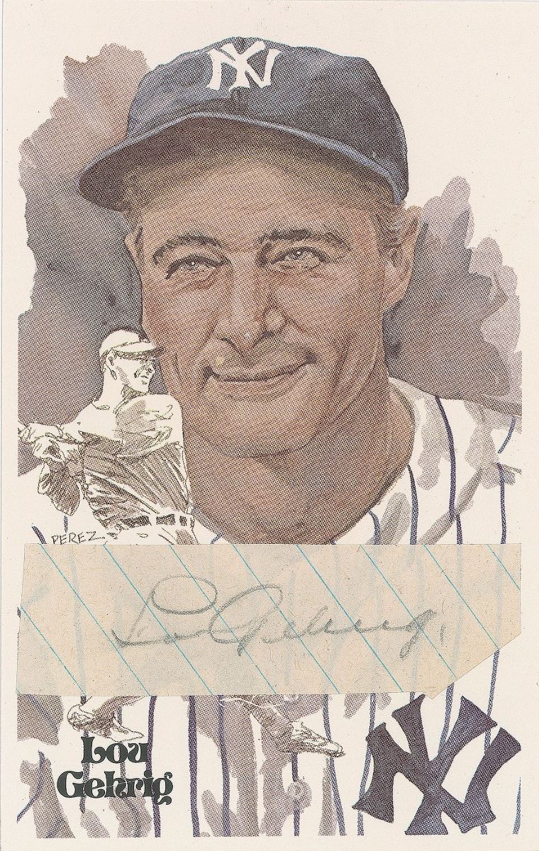 Sought-after pencil signature, “Lou Gehrig,” on an off-white 3.25 x 1 lightly-lined slip affixed to a color 3.5 x 5.5 postcard from Perez-Steele Galleries. In fine condition.
