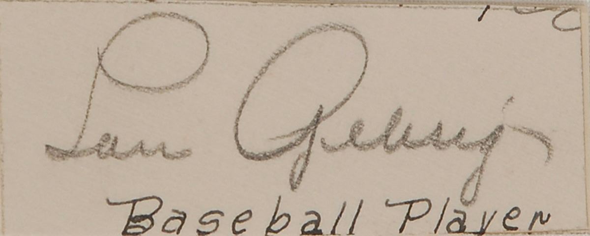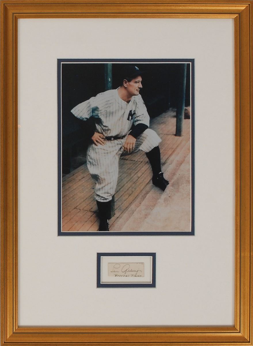 Sought-after pencil signature, “Lou Gehrig,” on an off-white 2 x .75 slip, with a collector’s ink notation below. Archivally mounted, cloth-matted, and framed with an image of Gehrig to an overall size of 14.75 x 20. In fine condition.