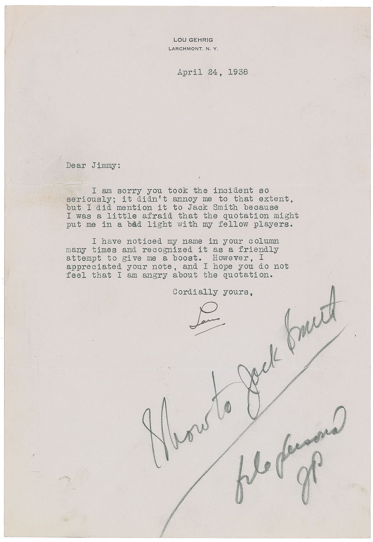 TLS signed “Lou,” one page, 7.25 x 10.5, personal letterhead, April 24, 1938. Letter to NY Daily News sportswriter Jimmy Powers, in full: "I am sorry you took the incident so seriously; it didn't annoy me to that extent, but I did mention it to Jack Smith because I was a little afraid that the quotation might put me in a bad light with my fellow players. I have noticed my name in your column many times and recognized it as a friendly attempt to give me a boost. However, I appreciated your note, and I hope you do no feel that I am angry about the quotation." The lower half bears pencil office notations in another hand. In fine condition, with a bit of light creasing near the salutation. Accompanied by a full letter of authenticity from PSA/DNA.