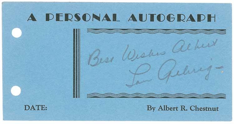 Outstanding vintage pencil signature and inscription, “Best wishes Albert, Lou Gehrig,” on a 5.5 x 2.75 blue card from the Albert R. Chestnut collection. Light paperclip impression to lower left corner, otherwise fine condition. From his Pennsylvania home, Chestnut, a printer by profession, began collecting autographs in 1935. He sent these personally-printed cards to over a thousand celebrities and received favorable replies from the vast majority, finally retiring from collecting to raise his family when postage increased from 2¢ per card! Pre-certified Steve Grad/PSA/DNA and RRAuction COA.