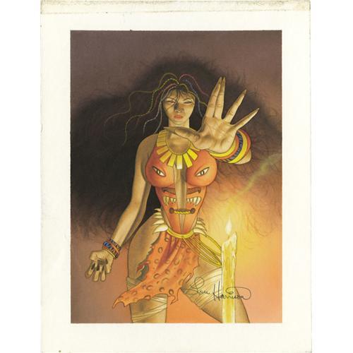 <B>Lou Harrison - 1995 Ultra Spider-Man Card Set "Calypso" Illustration Original Art (Fleer, 1995).</B></I> Sexy bad girl Calypso is brought to vivid life for this outstanding Fleer card set. The jungle temptress shows she's not to be trifled with, while artist Lou Harrison makes with the earth-tones and the dangerous curves. The image area measures 5.25" x 7.5" and is in Excellent condition.