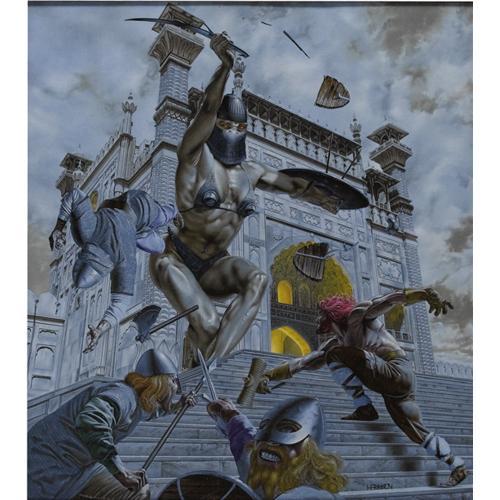<B>Lou Harrison - "Encounter in Graphur" Painting Original Art (circa 1985).</B></I> Let's get ready to <I>rrrrumble</B></I> -- five fearless warriors lunge to meet the attack of a thirty-foot amazon! Only problem is -- they're losing. When Lou Harrison bought his first comic book, <B>Thor</B></I>, his interest and love of fantasy art began. After graduating from the Joe Kubert School, Harrison's first cover assignment was for <B>The Savage Sword of Conan</B></I>. Since then, he has painted numerous Marvel characters for a variety of products as well as nine cards for the <B>Star Wars' Finest</B></I> card set from Topps. This action-packed oil on board painting has an image area of 18" x 20". The art is framed and in Excellent condition. Signed at the lower right.<BR><BR><b>Shipping:</b> Framed (<a target="_blank" href="http://www.heritageauctions.com/common/shipping.php">view shipping information</a>)