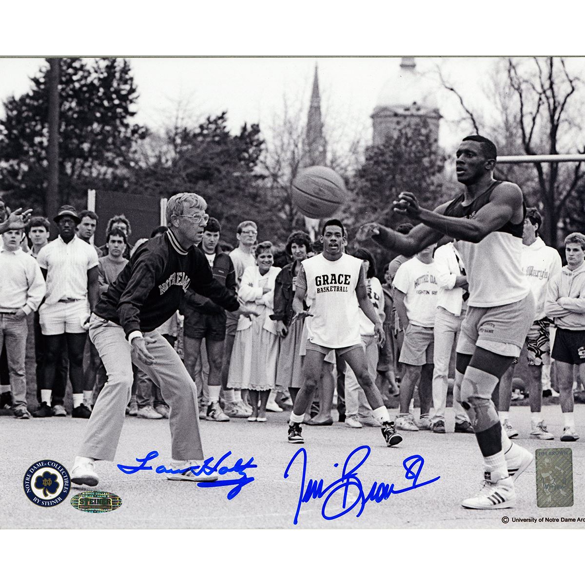Lou Holtz/Tim Brown Dual Signed Playing Basketball 8x10 Photo