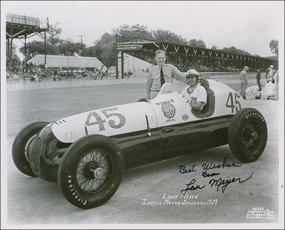 Pre-World War II three-time Indy 500 winner. Glossy 10 x 8 photo seated in his car at the 1939 race, signed in black ink, “Best Wishes from Lou Meyer.” In fine condition, with few creases, bends, and area of light staining over the first part of his name.