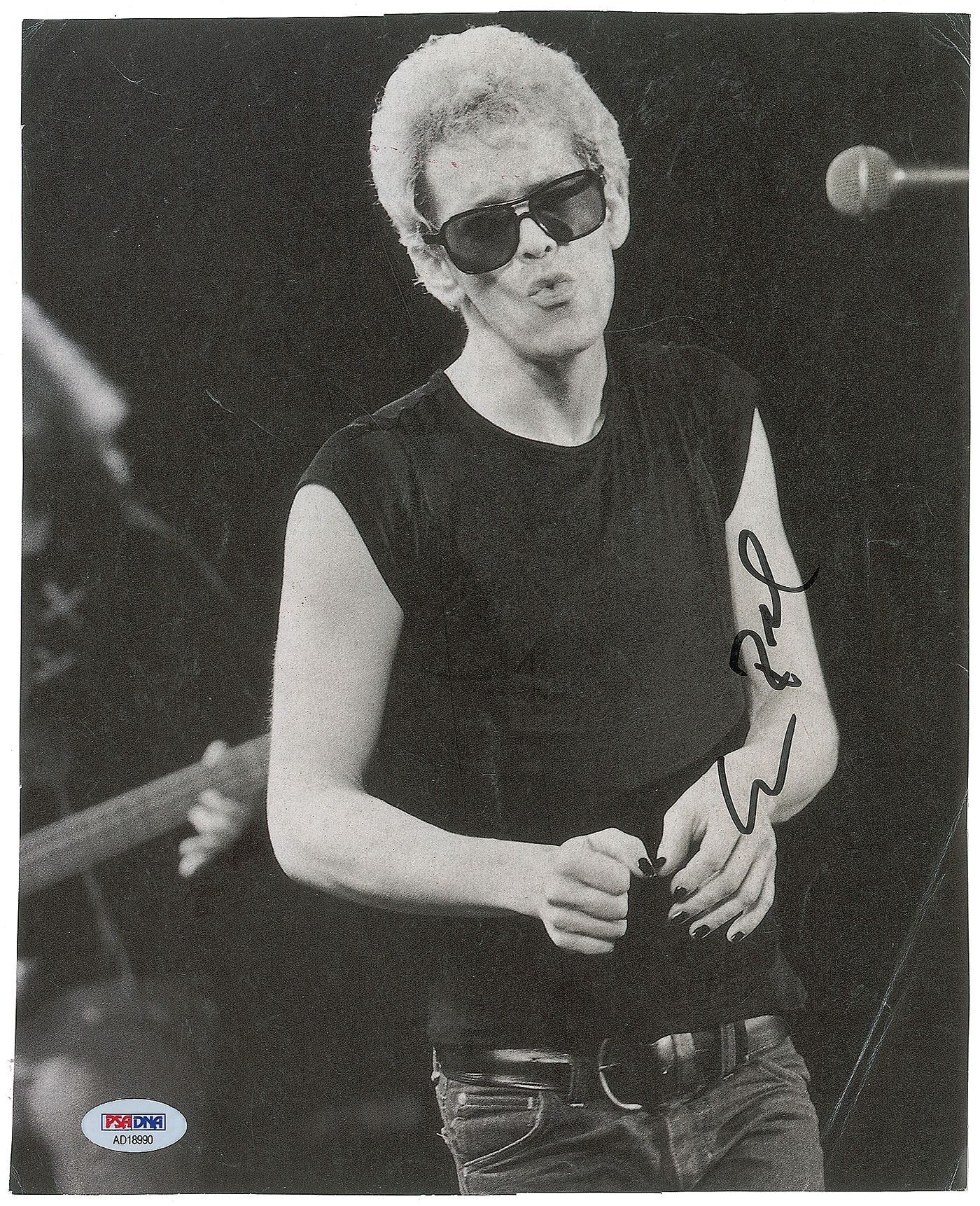 Semi-glossy 9 x 11.25 book photo of Reed during a live performance, signed in person in black felt tip. In fine condition, with scattered light creasing and scratching, and a heavier crease to the lower right corner. Accompanied by a certificate of authenticity from PSA/DNA.