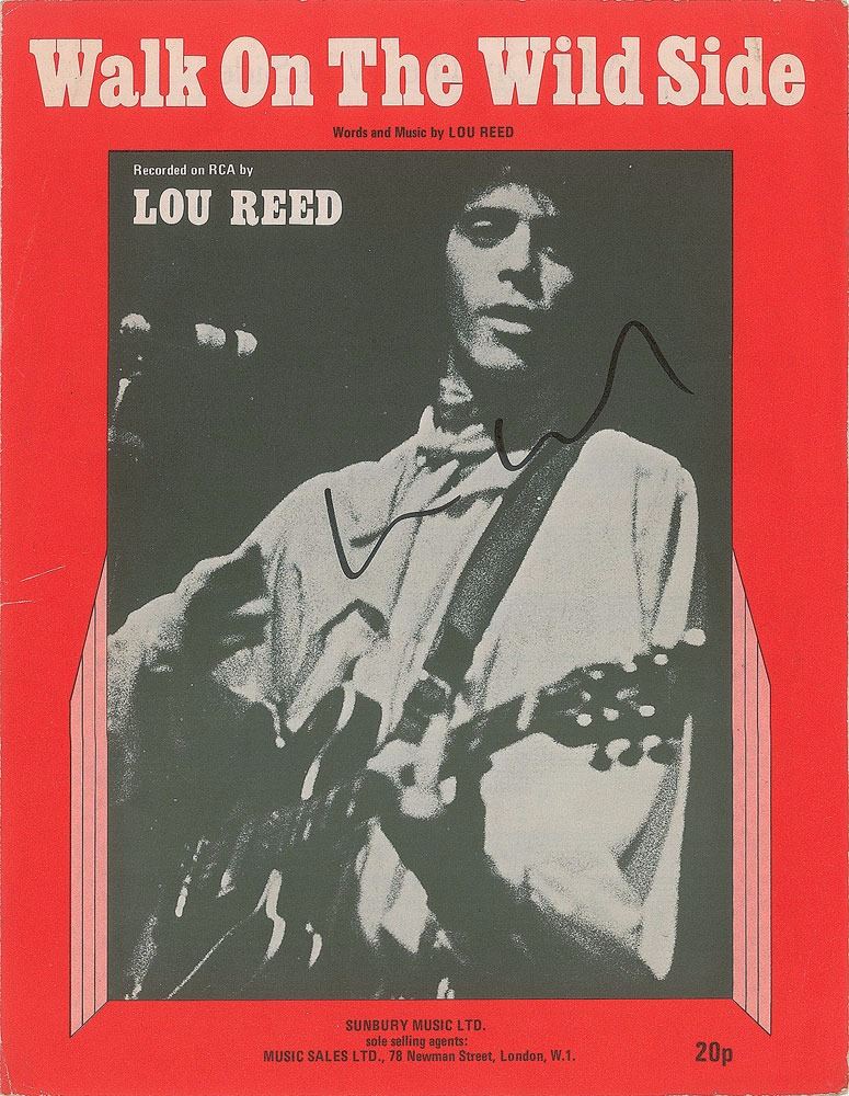 Sunbury Music Limited lyrics and sheet music booklet for the song 'Walk On the Wild Side," four pages, 8.5 x 11, signed on the front in black felt tip by Reed. In fine condition, with scattered light creasing.