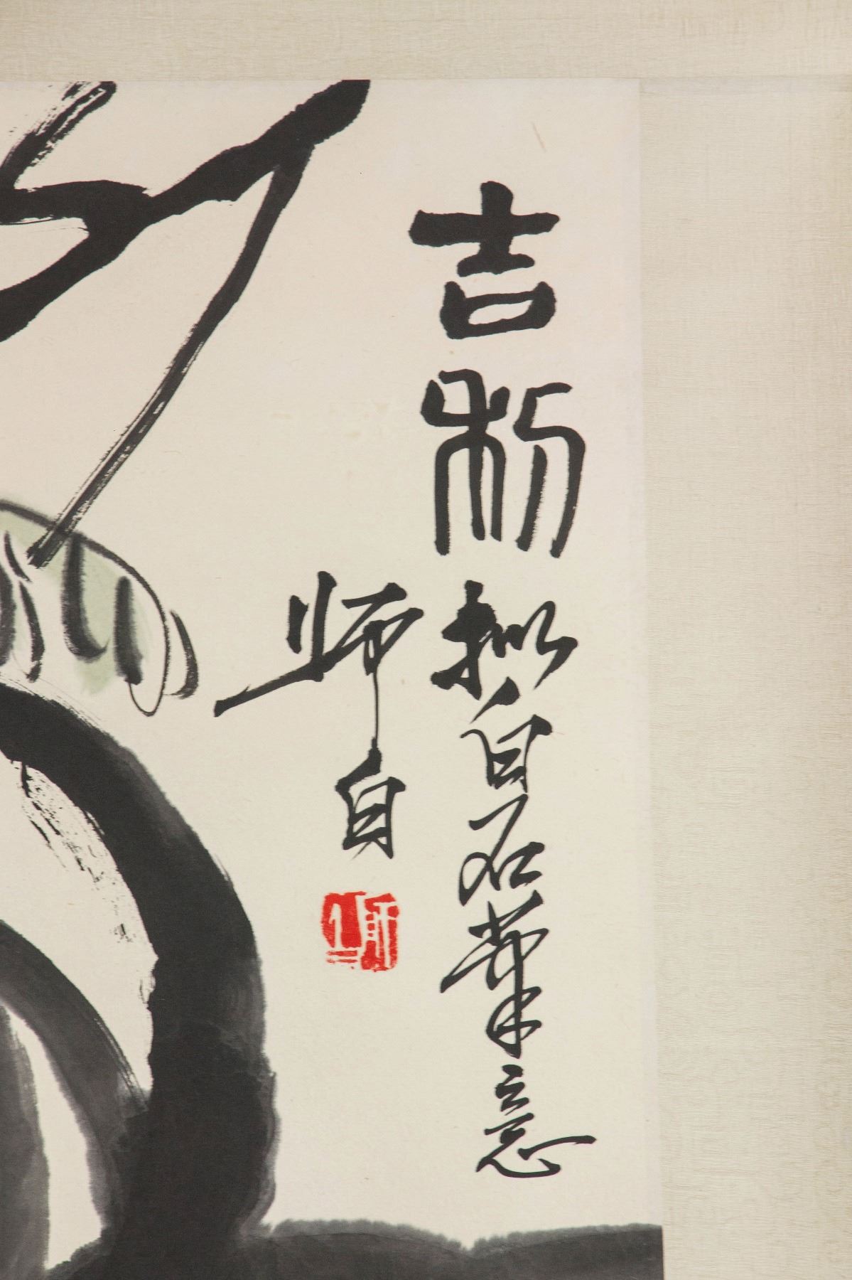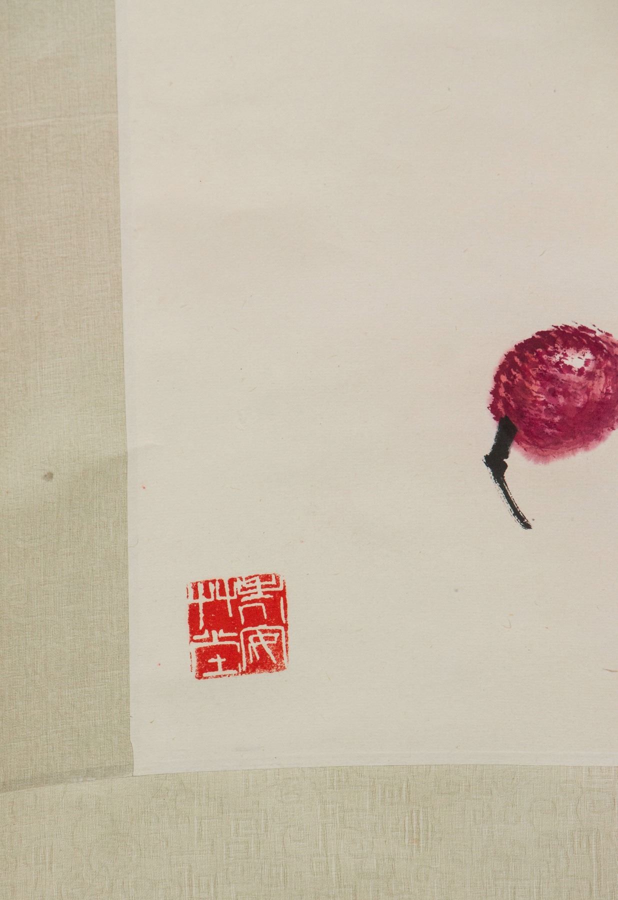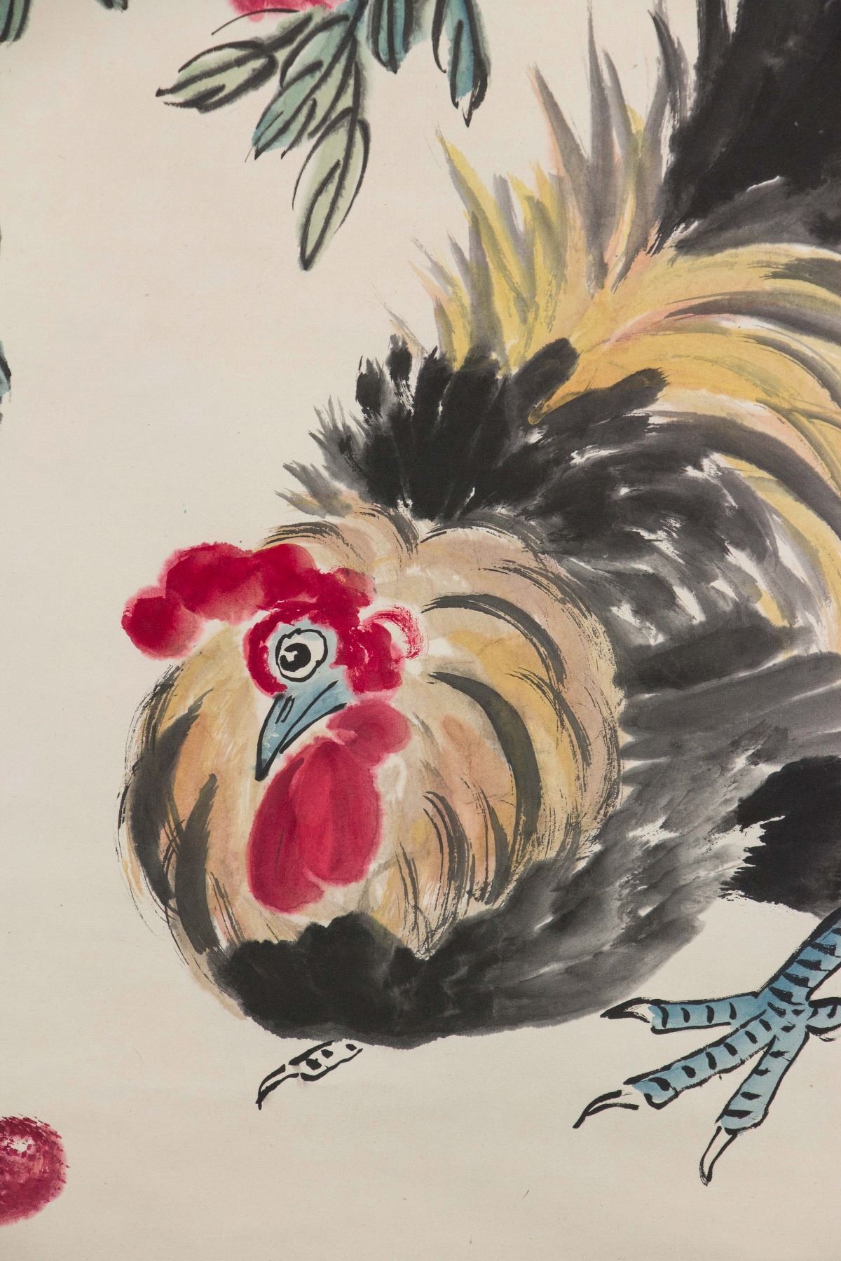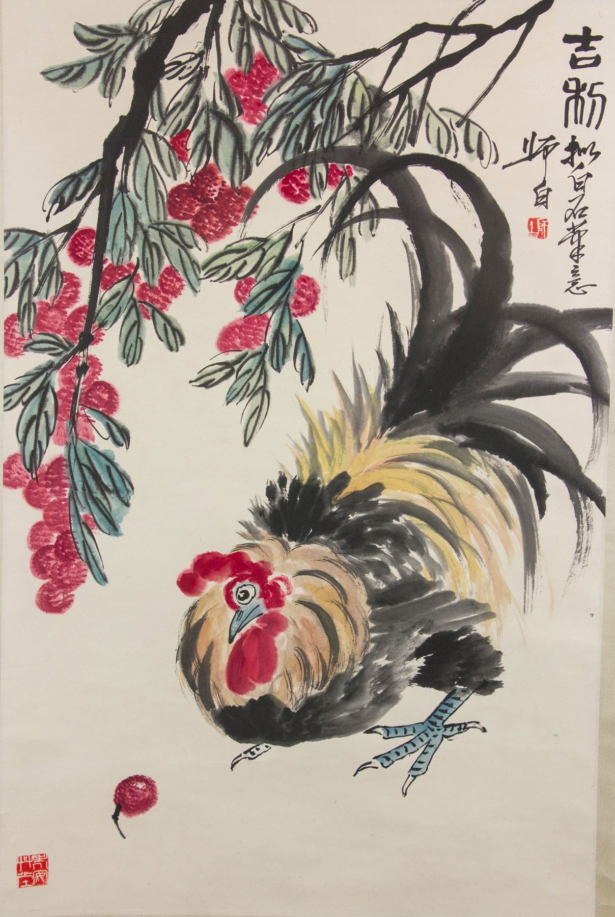 Painting or rooster and Chinese bayberry; Chinese ink and watercolour on paper; hanging scroll; signed Lou Shibai (1918-2010); inscribed with 2 artist seals; 102 cm x 67 cm