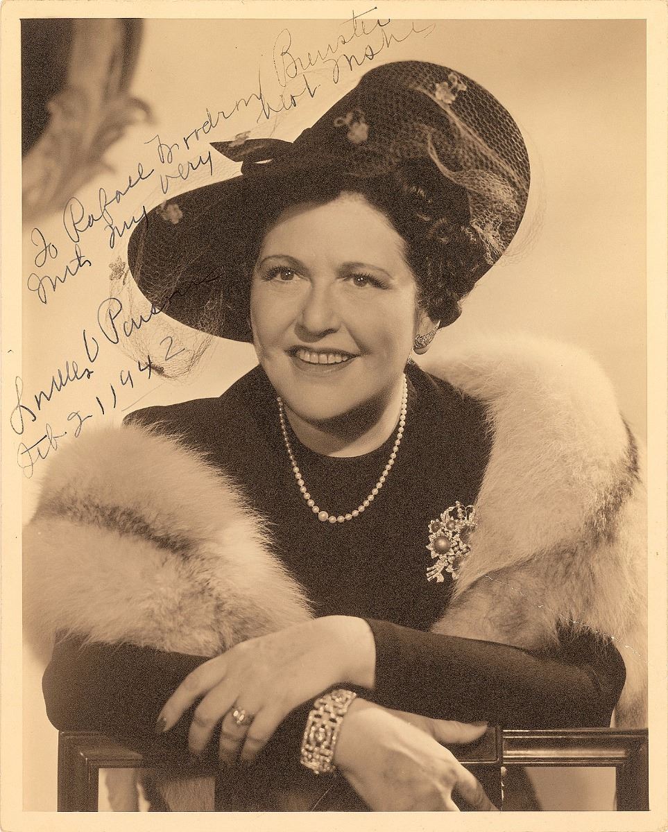 America’s first movie columnist (1881–1972) whose columns were read by 20 million people. Vintage matte-finish 8 x 10 photo of Parsons in a fur stole and fancy hat, signed and inscribed in fountain pen, “To Rafael…Brewster, With my very best wishes, Louella Parsons, Feb. 2, 1942.” Reverse bears a Tom Kelley photography stamp. In fine condition, with repaired diagonal tear to lower right.