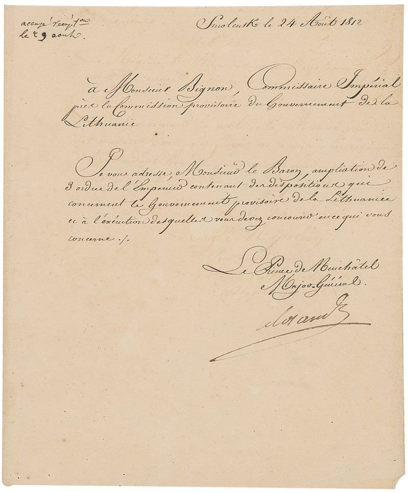 One of Napoleon’s favorite Marshals (1753–1815). LS in French, signed “A. Berthier,” one page, 8.25 x 10, August 24, 1812, dated from Smolensk during the campaign of Russia. To Monsieur Bignon, Imperial Commissaire in charge of the Government of Lithuania, sending Napoleon’s instructions for the provisional government of Lithuania. Central horizontal and vertical fold, some light toning and creasing, and a few small edge tears, otherwise fine condition.