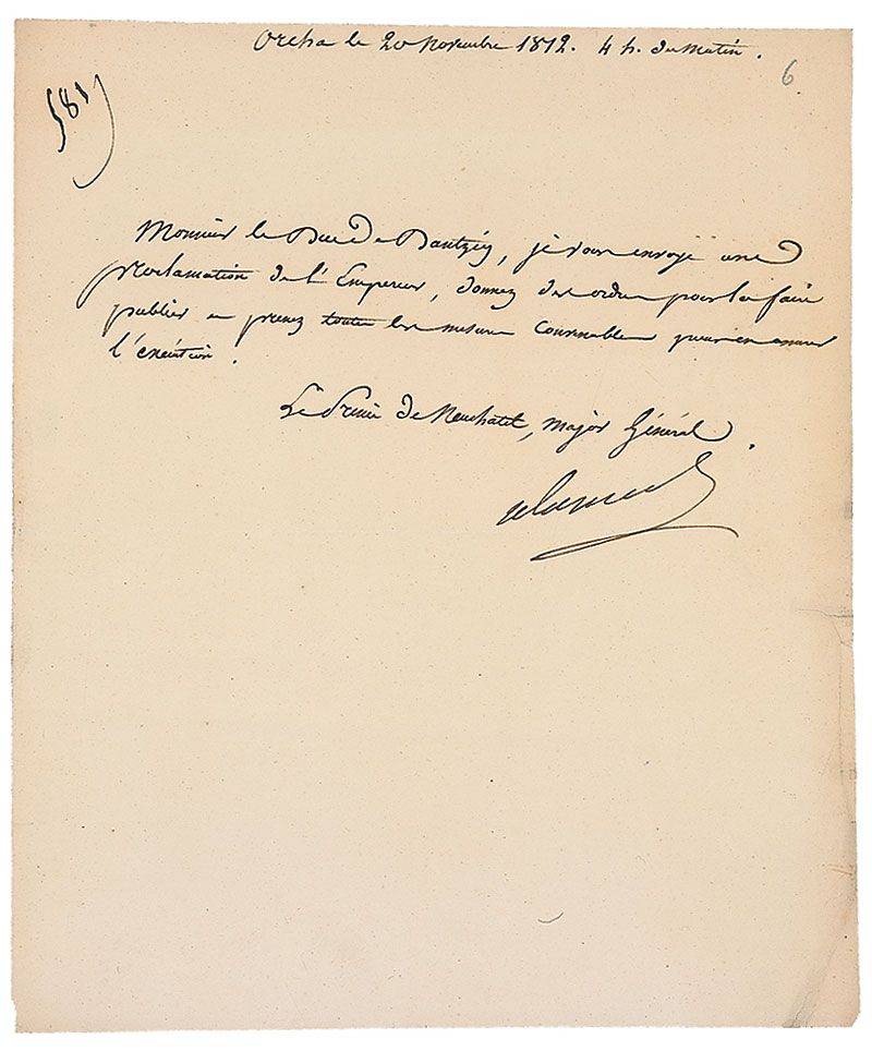 One of Napoleon’s favorite Marshals and his chief of staff (1753–1815). LS in French, signed “Alexandre,” one page, 8 x 9.5, Orcha, November 20, 1872. Significant letter to Marshal Lefevre, Duke of Dantzig, written from the Russian city of Orcha during the retreat from the disastrous campaign of Russia. Bertier sends Napoleon’s proclamation for publication and asks Lefevre to guarantee its enforcement. Less than one week later, Napoleon would concede defeat and announce his retreat, crossing the river Berezina; the campaign remains in the French collective memory as an unprecedented immense disaster. In fine condition, with some mild toning and creasing along right edge.
