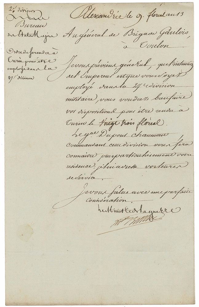 One of Napoleon's favorite Marshals (1753-1815), serving as his Chief of Staff from the start of his first Italian campaign in 1796 until his first abdication in 1814. Manuscript DS in French, one page, 7.75 x 12.5, April 29, 1805. Military order from Alessandria in northwestern Italy directing General Joseph Yves Menigault-Gaulois to report to Turin no later than May 13, 1805. At the time of this edict, Menigault-Gaulois was then stationed at Toulon, approximately 270 miles to the southwest of Turin, giving just under two weeks to report to the upper Piedmont region, where he was designated to support the 27th Division commanded by Pierre Dupont l’Etang. Signed at the conclusion by Berthier as Minister of War. In fine condition.