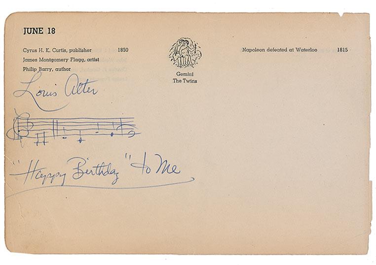 Songwriter and composer (1902–1980) twice nominated for Academy Awards. AMQS on an off-white 7.5 x 5.5 daily planner sheet. Alter pens three bars of music to ‘Happy Birthday,’ signing above, “Louis Alter.” In very good condition, with small tears to left edge and scattered toning and creasing.