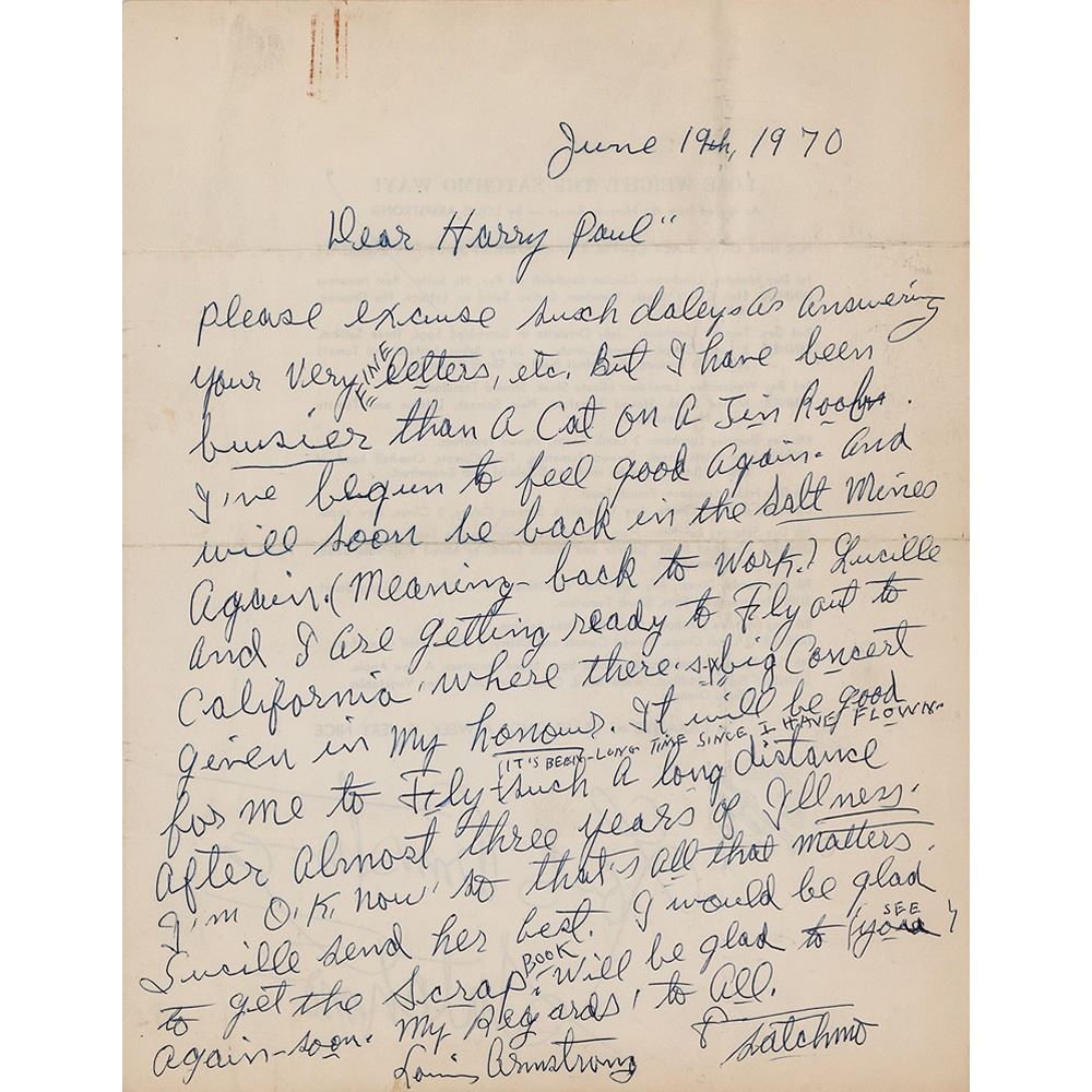 ALS signed “Louis Armstrong, Satchmo,” one page on the reverse of a 8.5 x 11 'Lose Weight The 'Satchmo' Way' flyer (featuring his facsimile signature), June 19, 1970. Handwritten letter to Harry Paul, in full: "Please excuse such delays as answering your very fine letters, etc., but I have been busier than a cat on a tin roof. I've begun to feel good again. And will soon be back in the Sale Mines again (Meaning back to work.) Lucille and I are getting ready to fly out to California where there's a big concert given in my honour. It will be good for me to fly such a long distance (it's been long time since I have flown) after almost three years of illness. I'm O.K. now so that's all that matters. Lucille send her best. I would be glad to get the scrapbook, will be glad to see you again soon." In fine condition, with a rusty paperclip impression to the top edge. Accompanied by the original mailing envelope (addressed in Armstrong's hand), affixed to a scrapbook page along with a 'Satchmo-Slogan: Leave It All Behind Ya' promo card and a packet of the Armstrong-endorsed Swiss-Kriss herbal laxative.